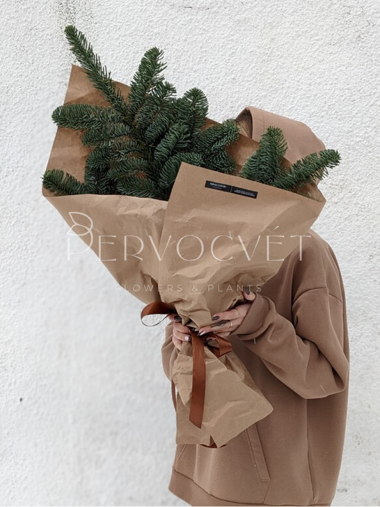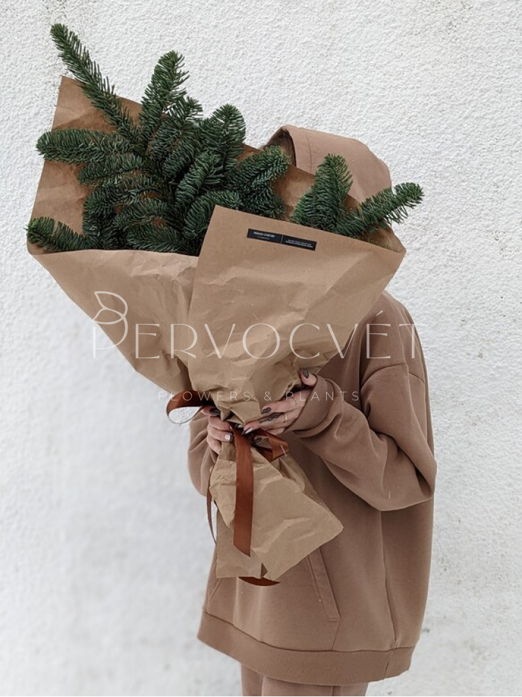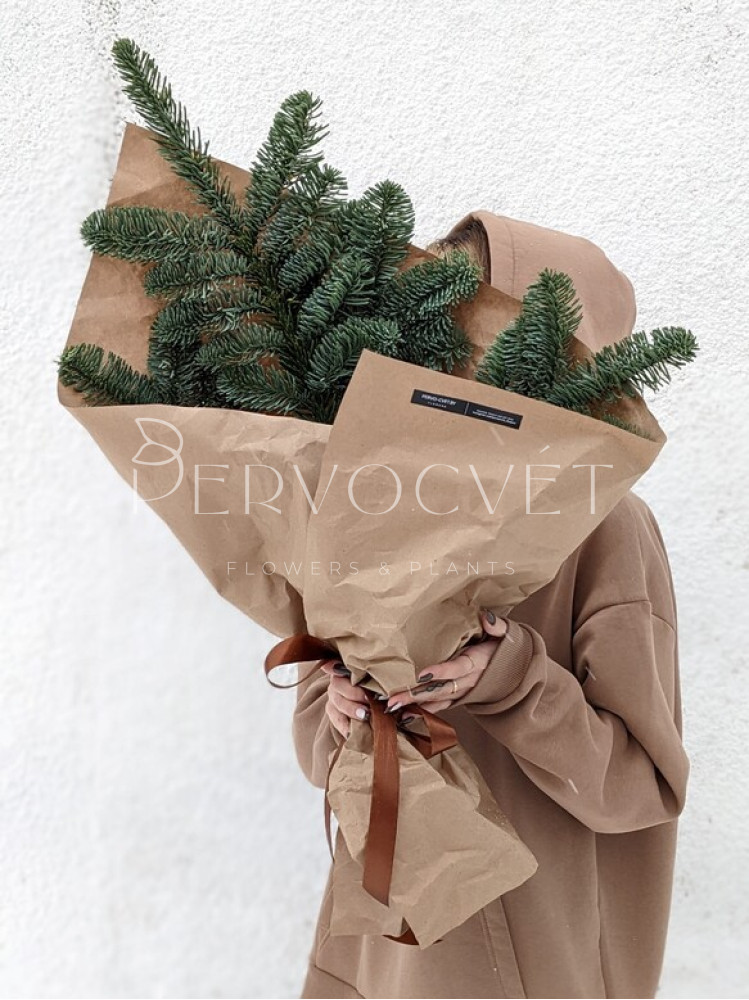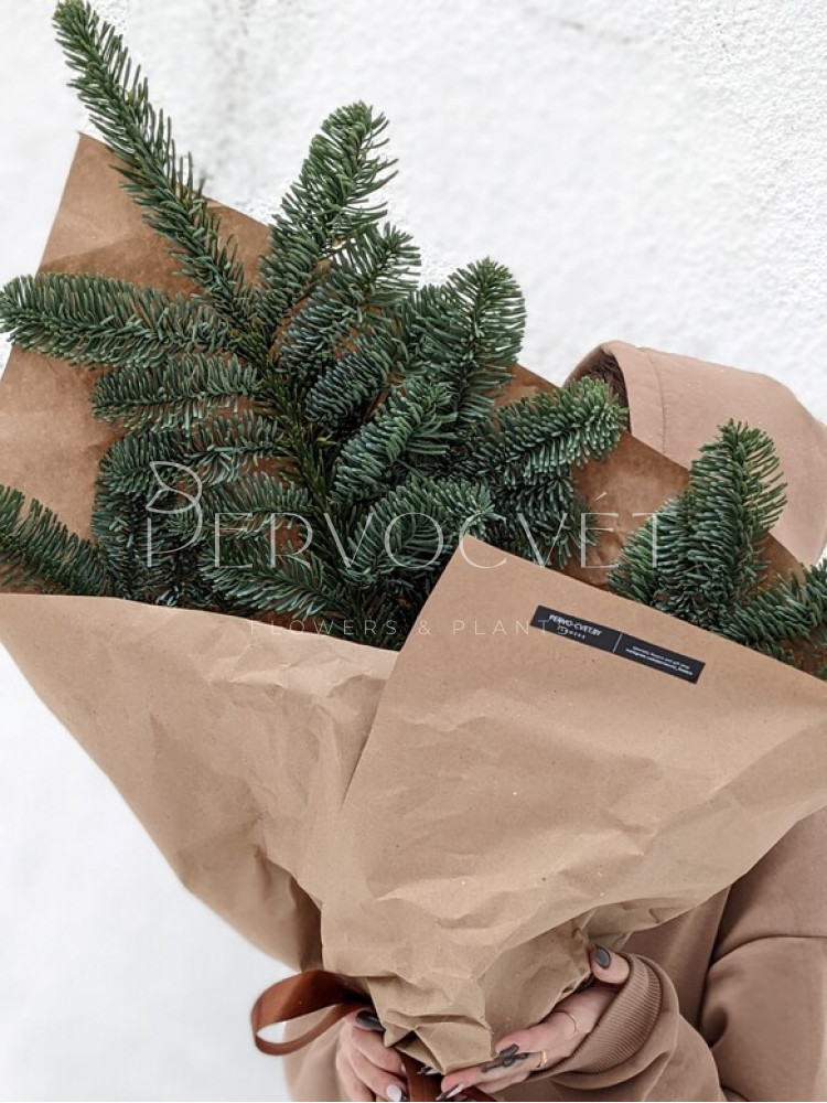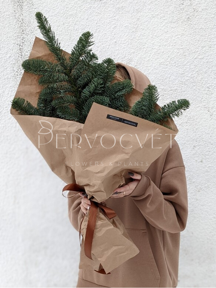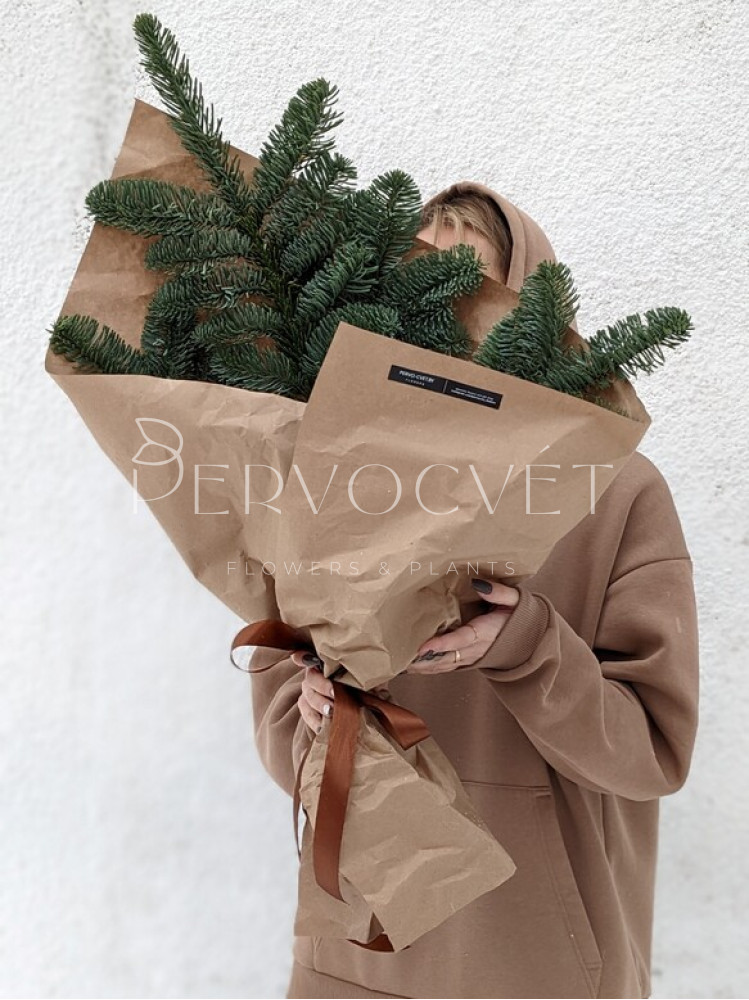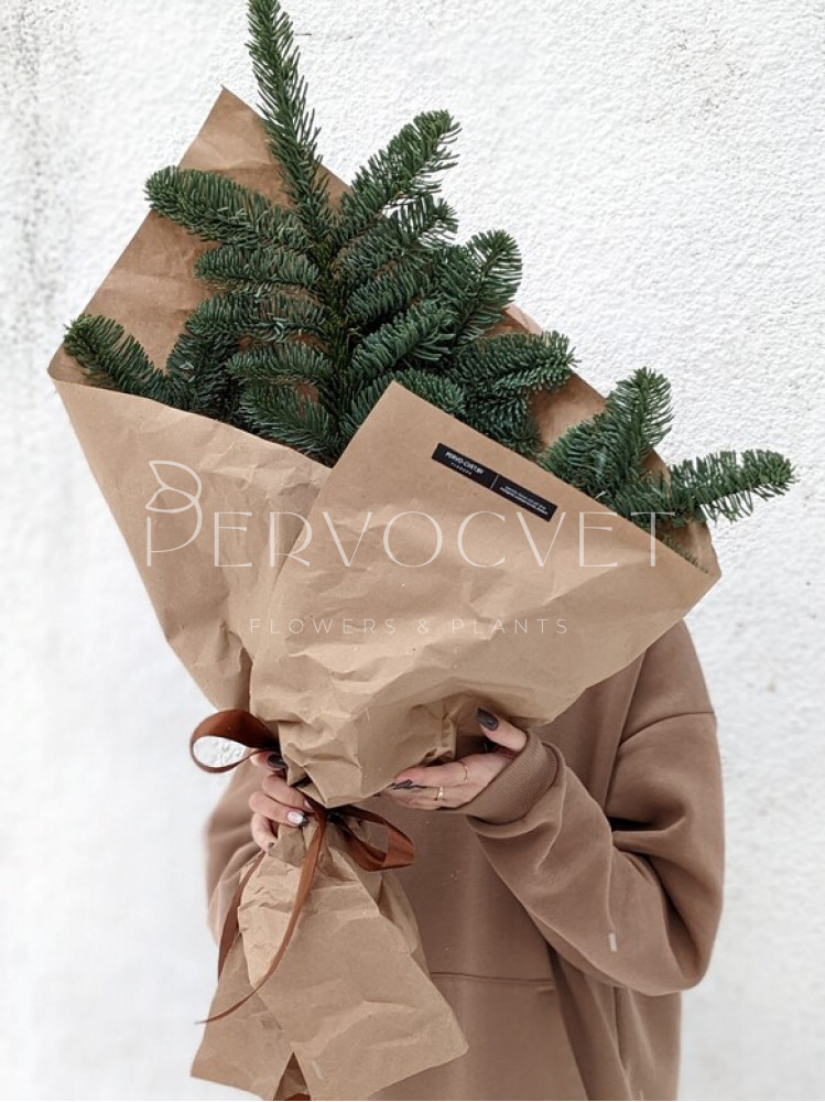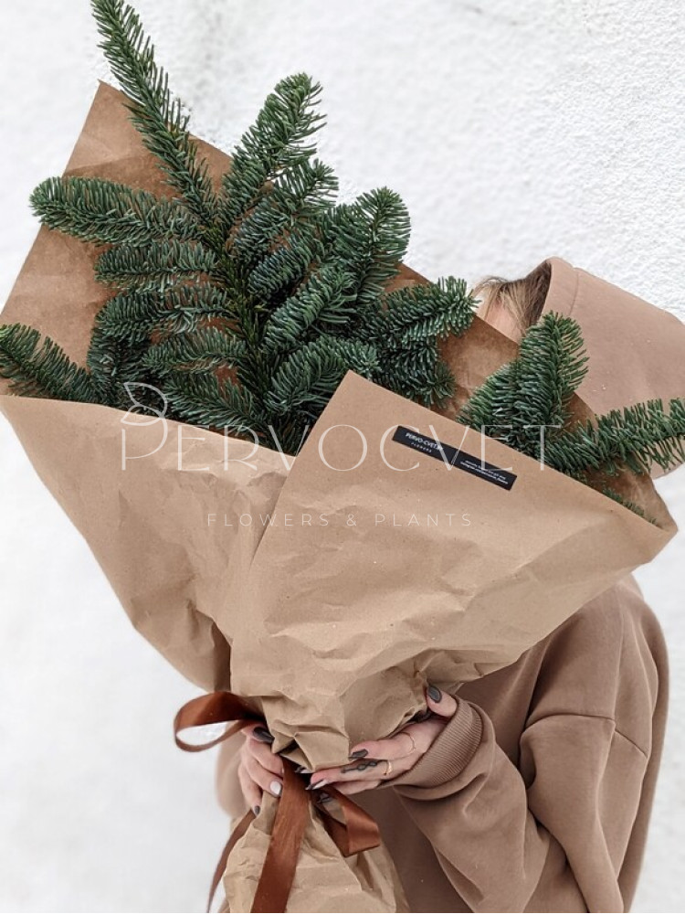 Натуральная ветка датской пушистой стойкой пихты Нобилис, оформленная в крафт с лентой! Идеальна для оформления пространстра, в качестве новогоднего декора и в том числе в качестве подарка!