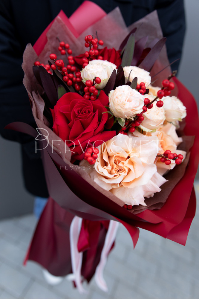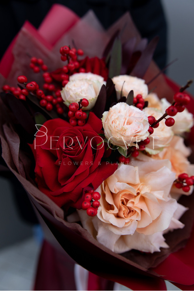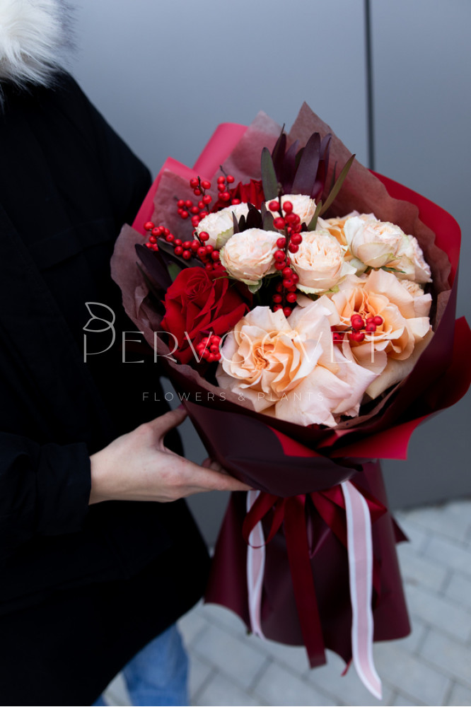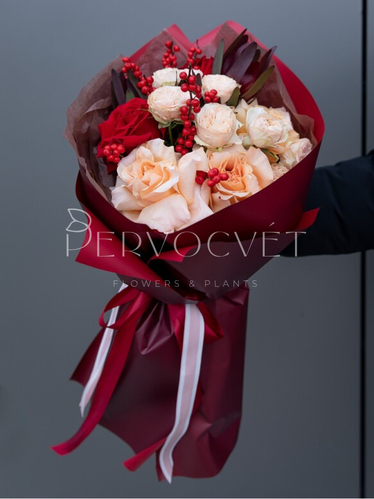 Цветы в составе | французская роза, пионовидная кустовая роза, иллекс красный, леукодендрон |