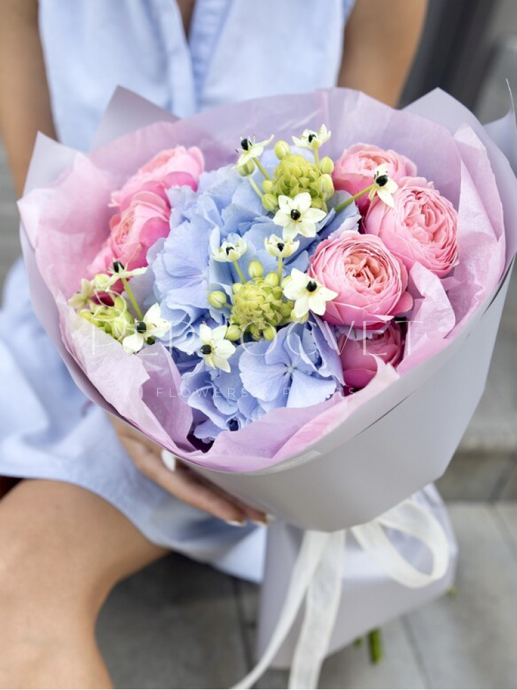 Цветы в составе | пионовидная кустовая роза, гортензия, орнитогалум |