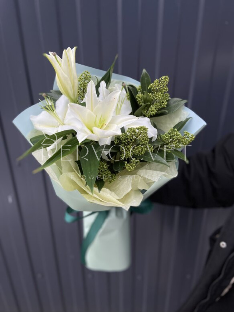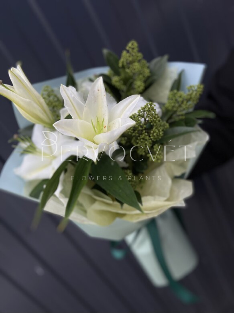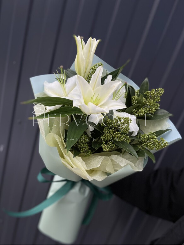 Стильный лаконичный букет из лилии и скиммии в пышной мятной упаковке! Элегантный и стойкий букет.