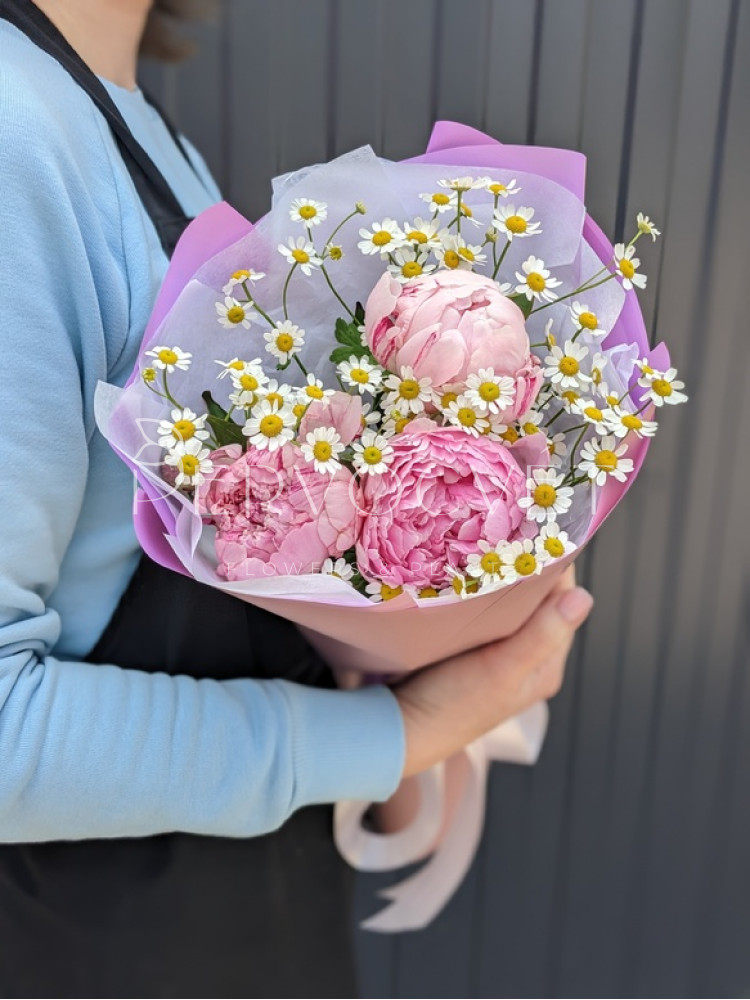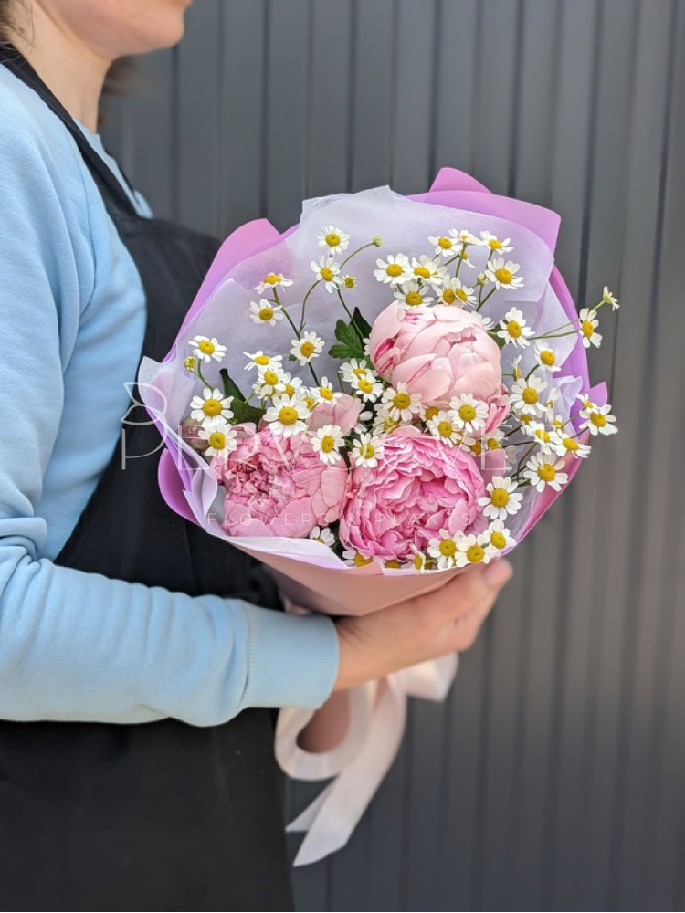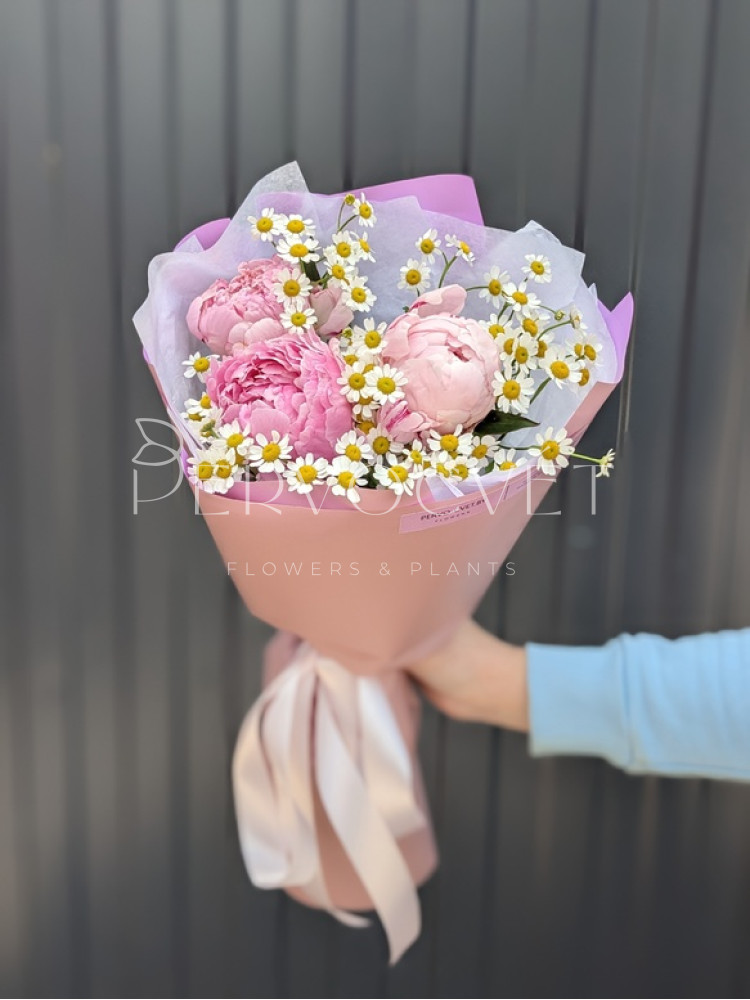 Полевой, садовый и прекрасный букет из пионов и ромашек танацетума. Стойкие импортные пионы Сара Бернар и кустовой танацетум идеальны друг с другом и одинаково любимы всеми!