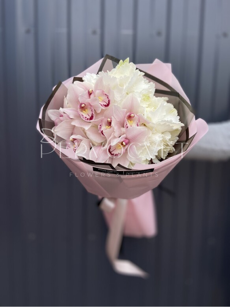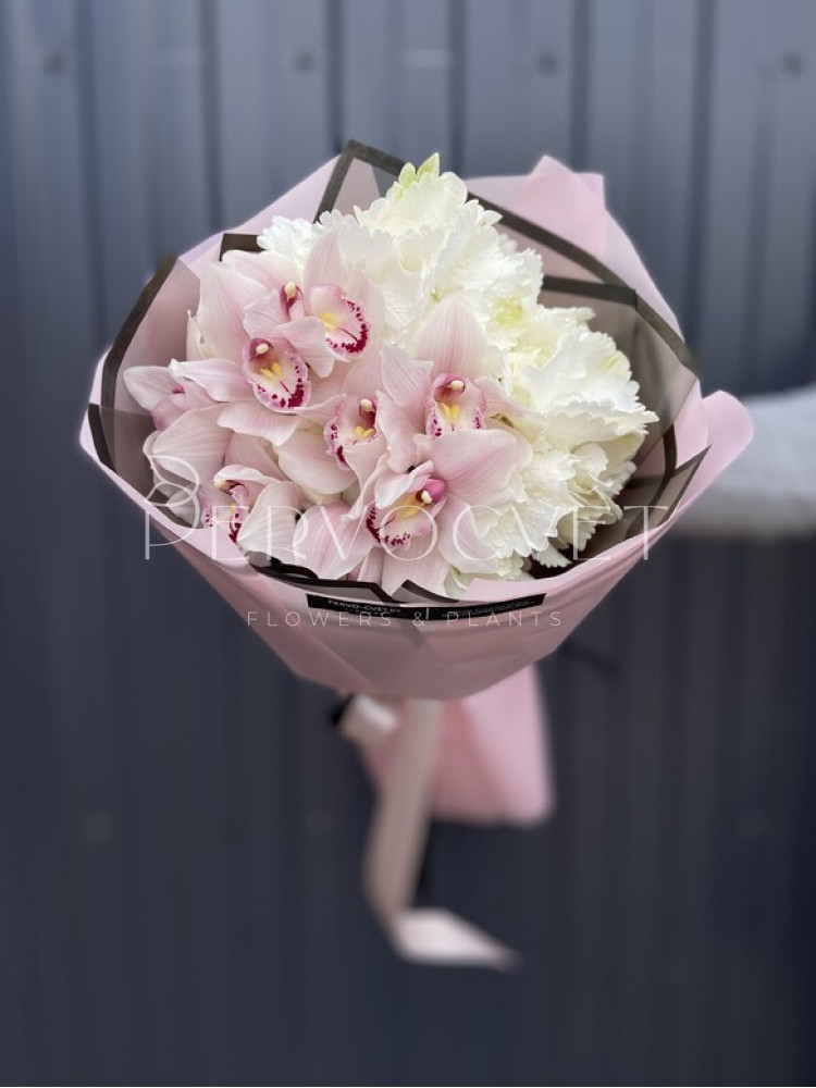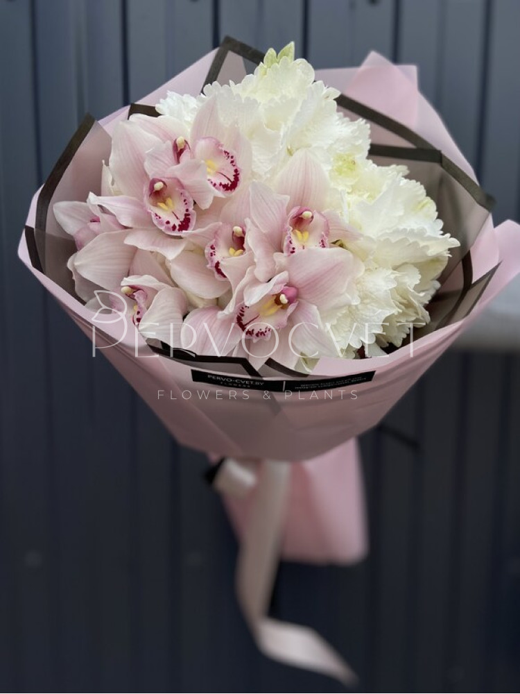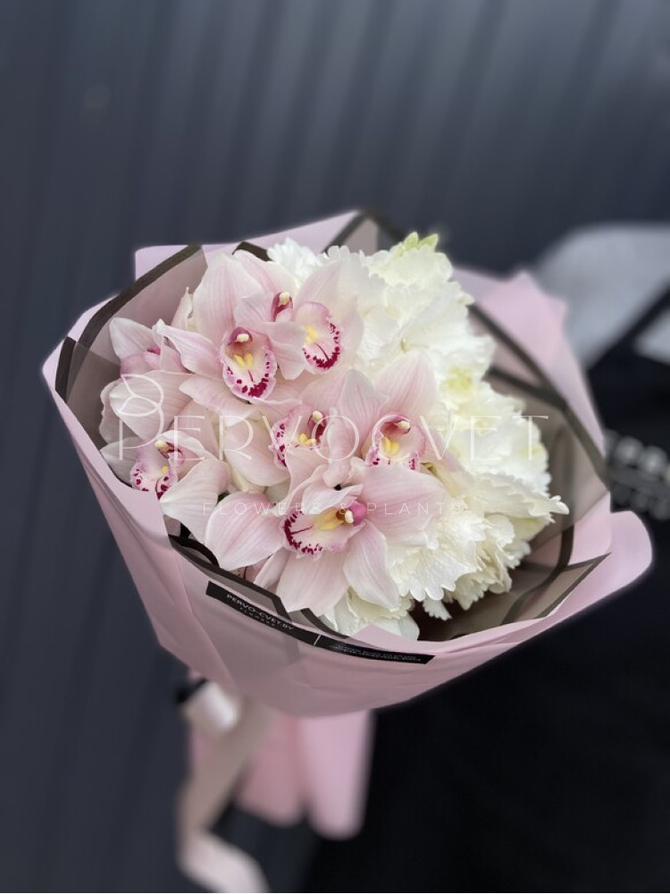 Дуо-букет из гортензии и орхидей сорта Цимбидиум! Классическое нежное сочетание белой гортензии и розовых орхидей идеальный подарок для любимой или близкого человека. Также можно рассмотреть варианты букеты с сиреневой, розовой или голубой гортензией; с фиолетовыми, белыми, бордовыми или зелеными орхидеями. Букет может быть выполнен в любых оттенках по Вашему желанию, уточните свои пожелания в комментариях к заказу или флористу по телефону.