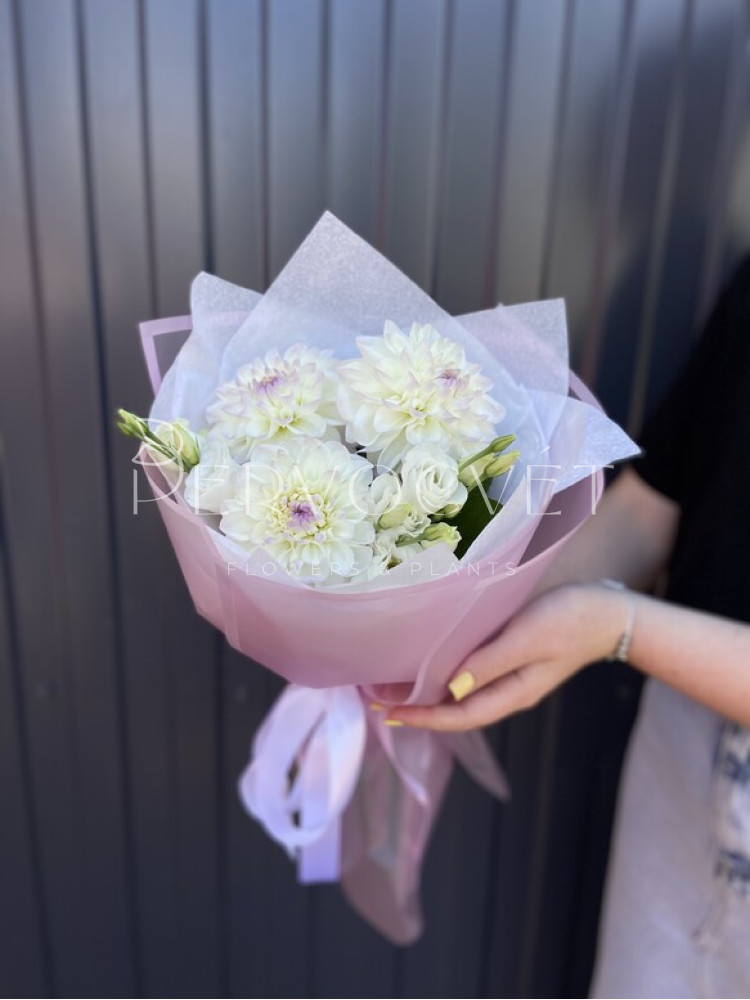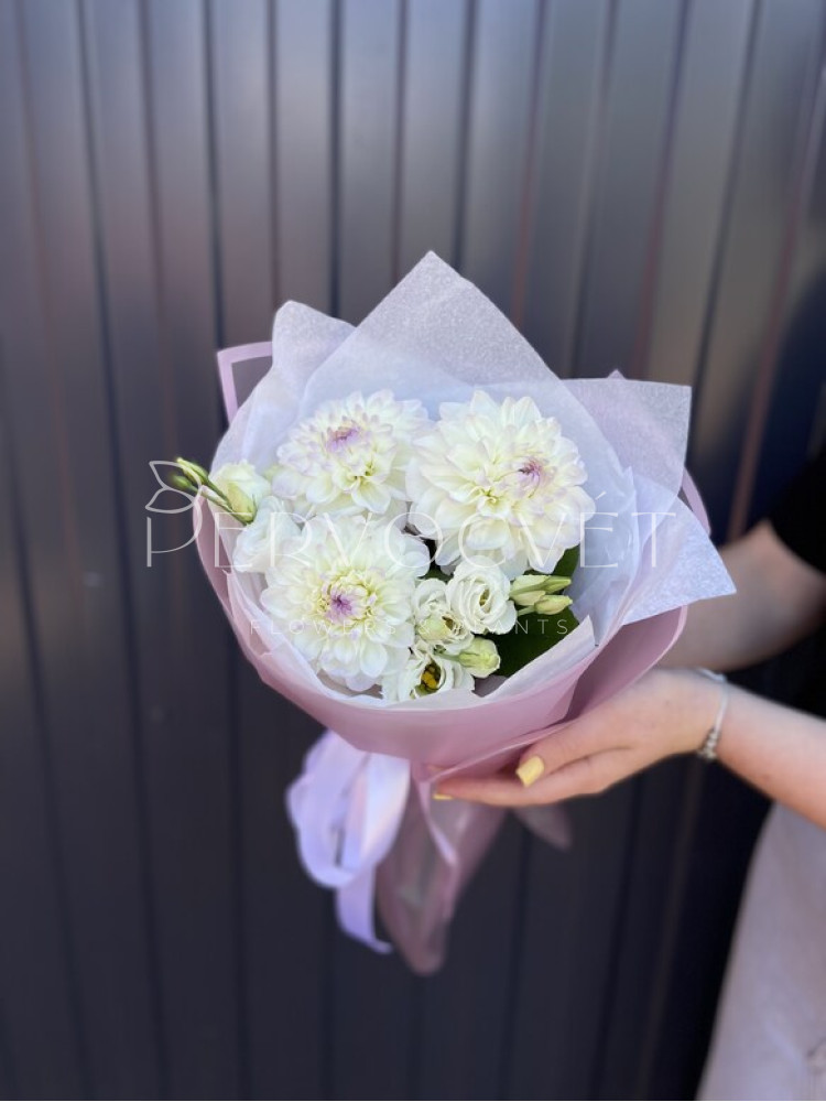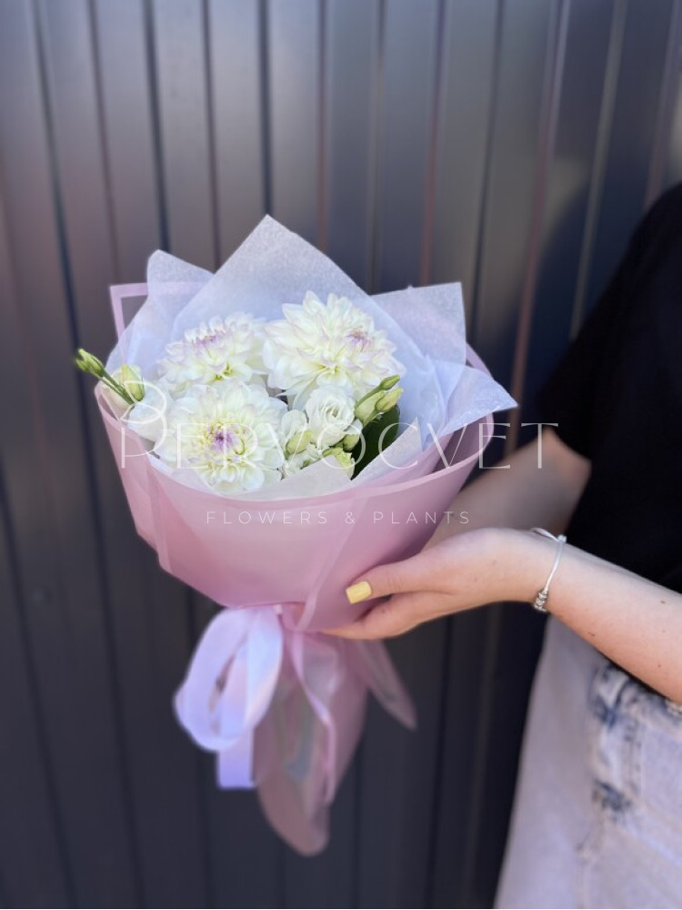 Нежный букет с бело-розовыми георгинами сорта Эвелин и белой кустовой эустомой. Нежное, сдержанное сочетание букета-комплимента для любого повода.