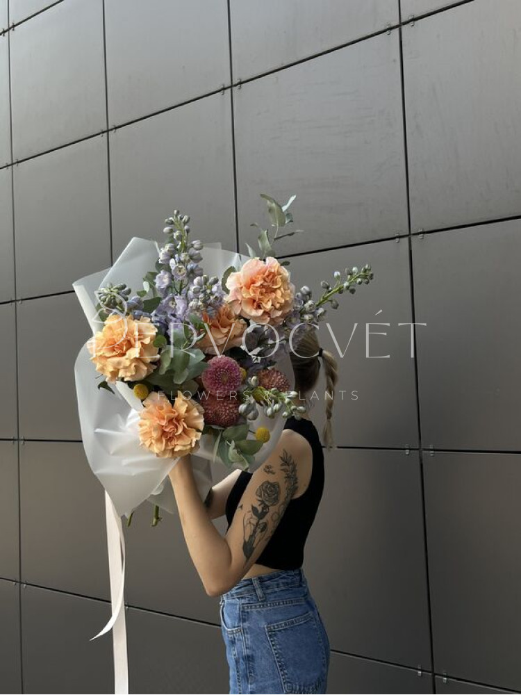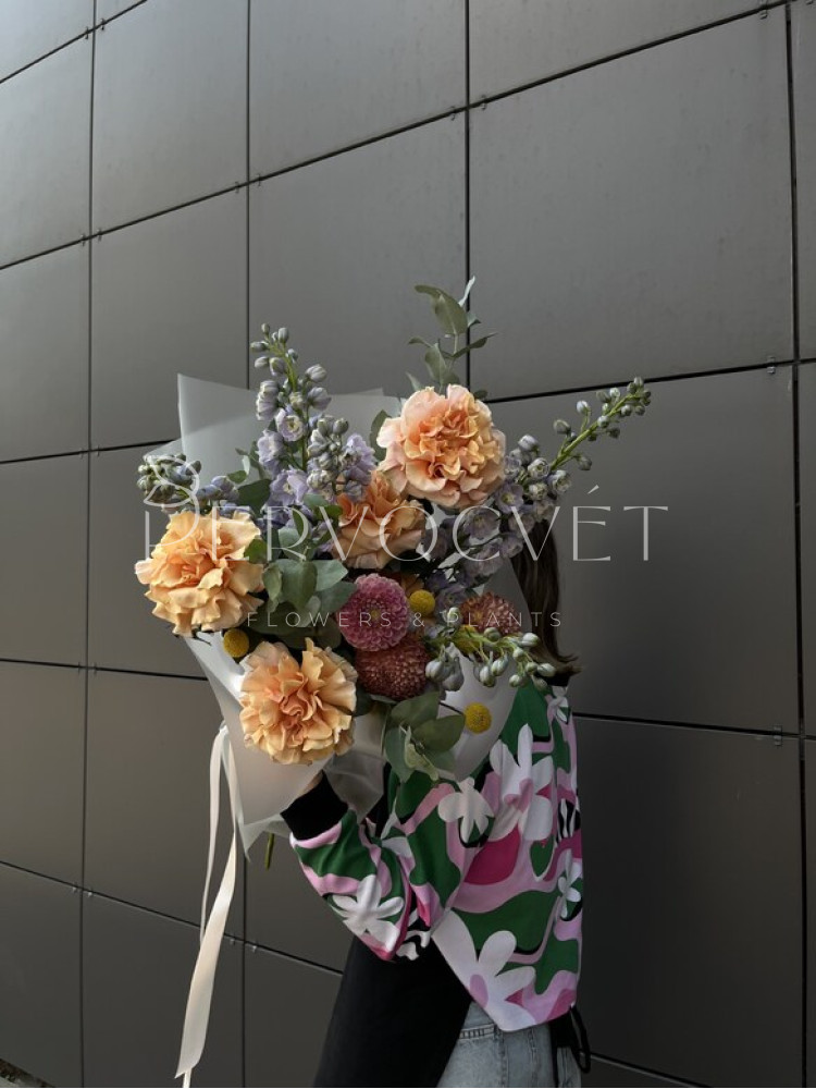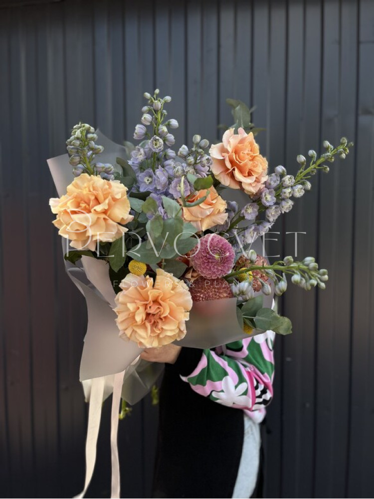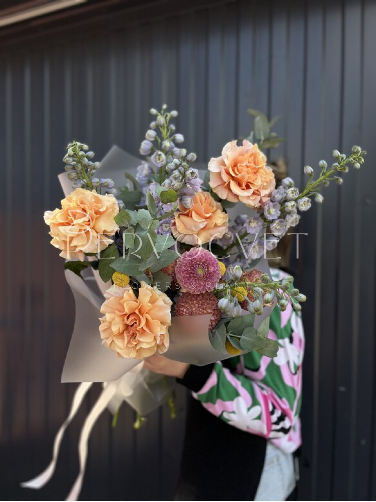 Стильный букет с сиреневым дельфиниум, двуцветными георгинами и персиковой французской розой! Истинный букет-растрепыш в современном оформлении.