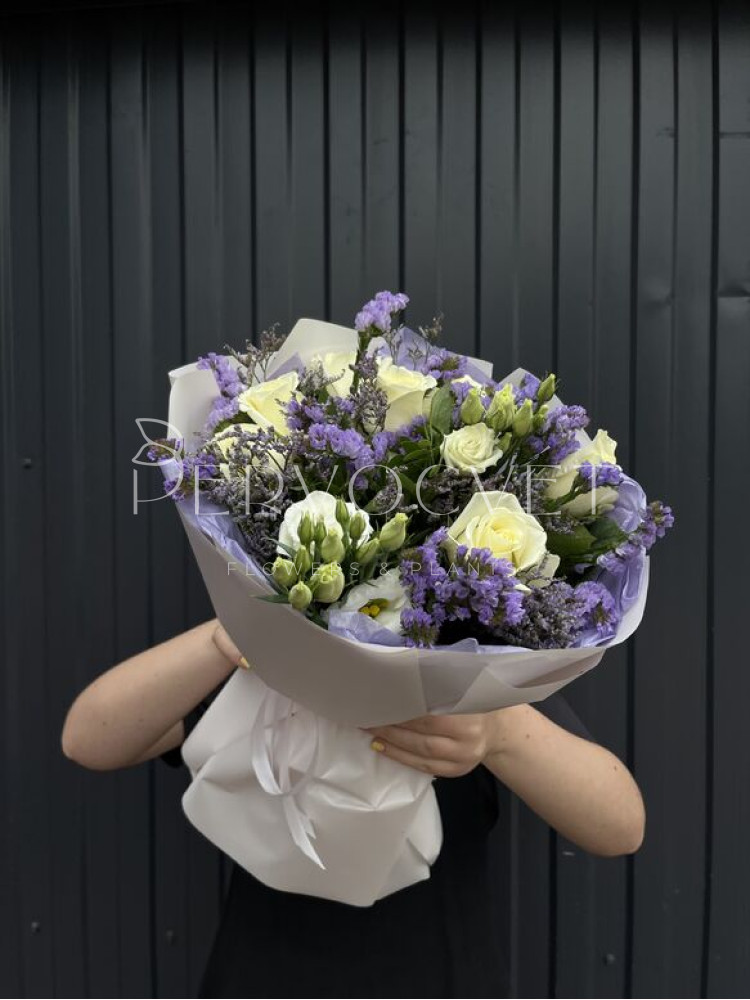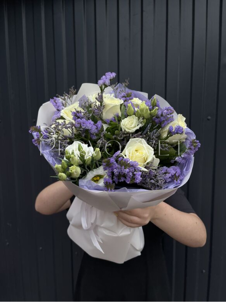 Букет с белыми розами сорта Мондиаль, белой эустомой и сиреневыми родственниками - статицей и лимониумом! Любимая многими бело-фиолетовая гамма, доступная в любое время года.