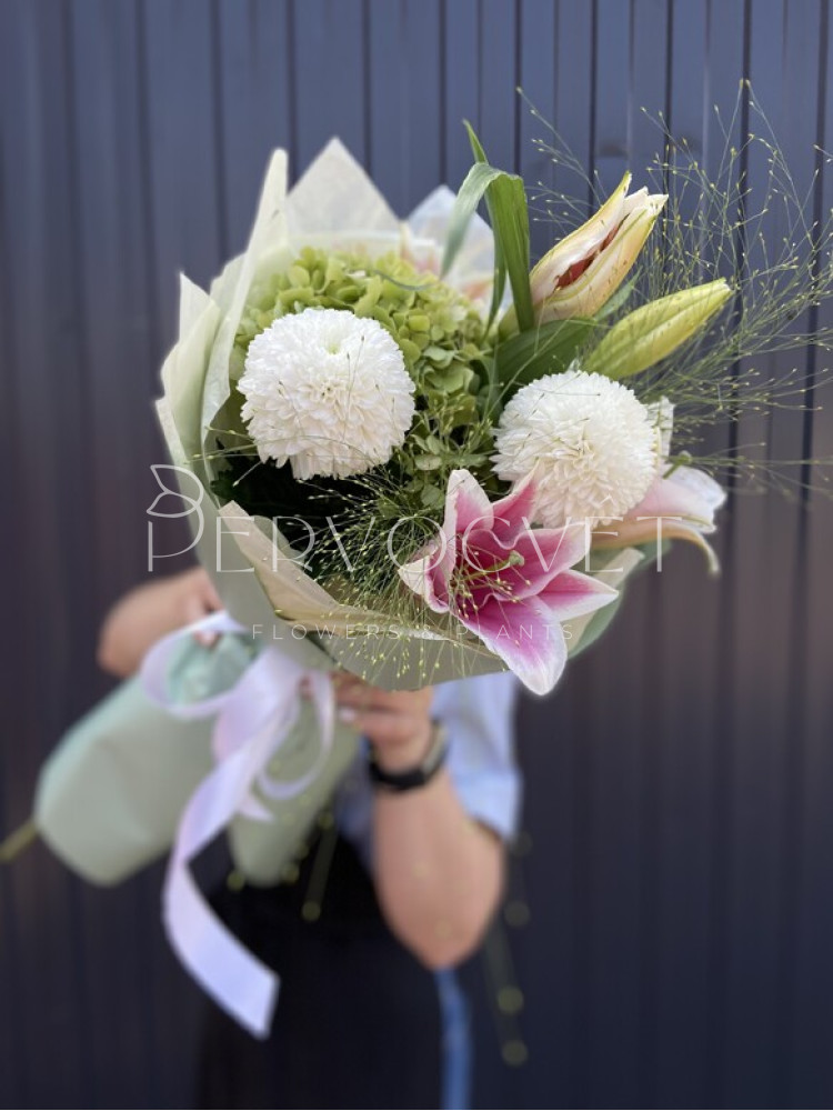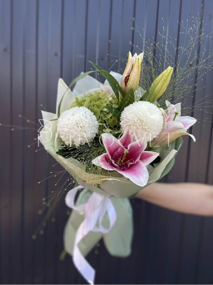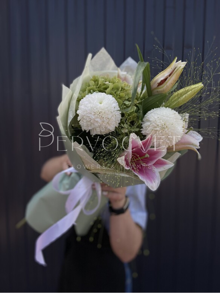 Интересный и пышный букет из ветки розовой Лилии, шариков хризантемы Супербоул, пышной шапки гортензии и пушистого Паникума. Супер-сочетание различных фактур стойких цветов!