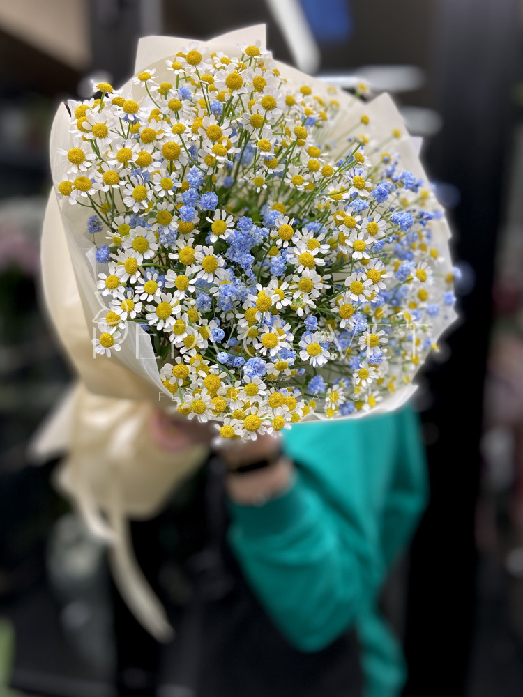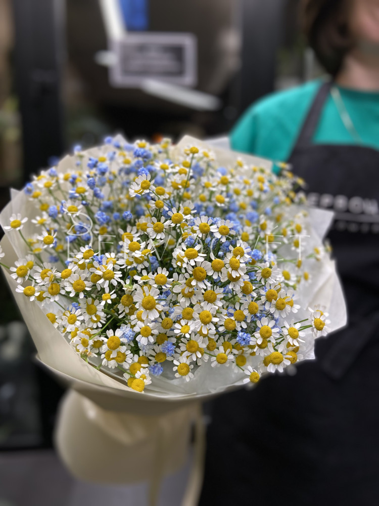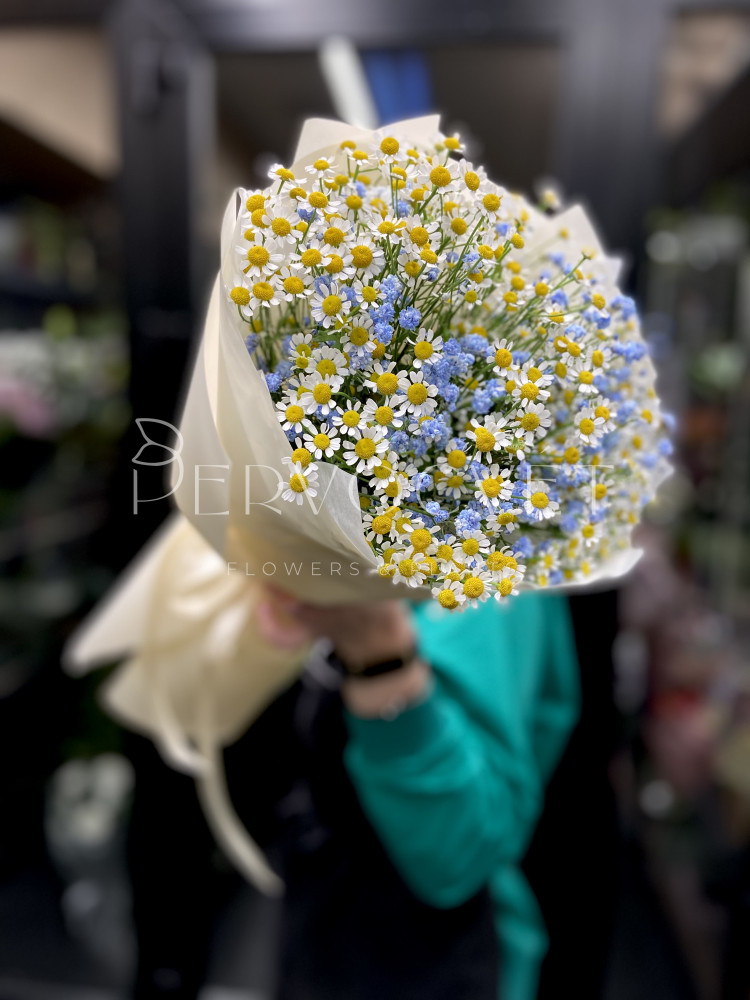 Стойкий букет из ромашек танацетума и небесно-голубой гипсофилы в пышном оформлении. Полевой, нежный, утонченный.