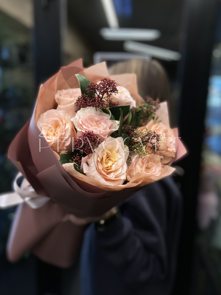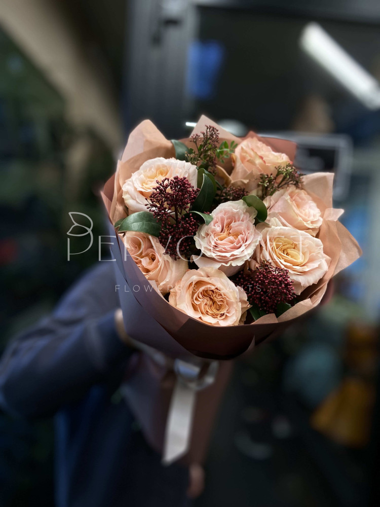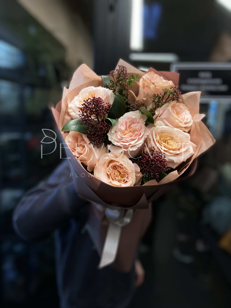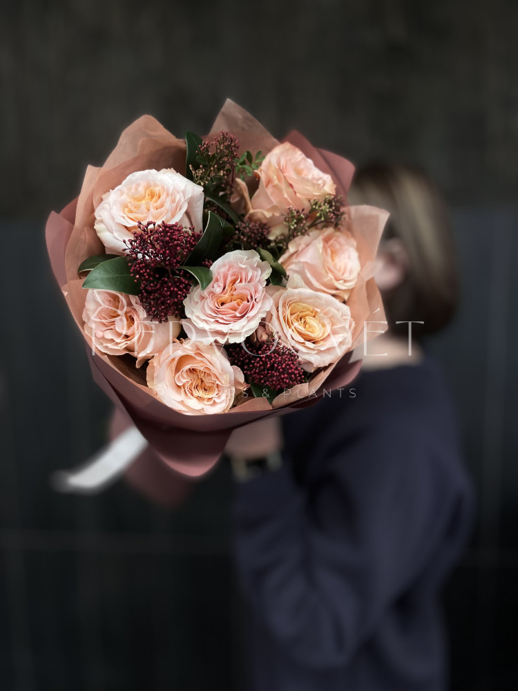 Моно-букет из персиковой пионовидной розы Кахала с красной зеленью скиммии. Букет в осенних оттенках или оттенках закатного солнца для любого повода!