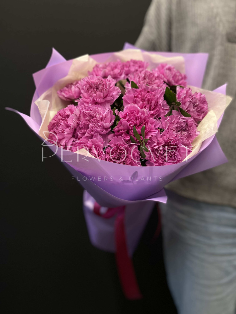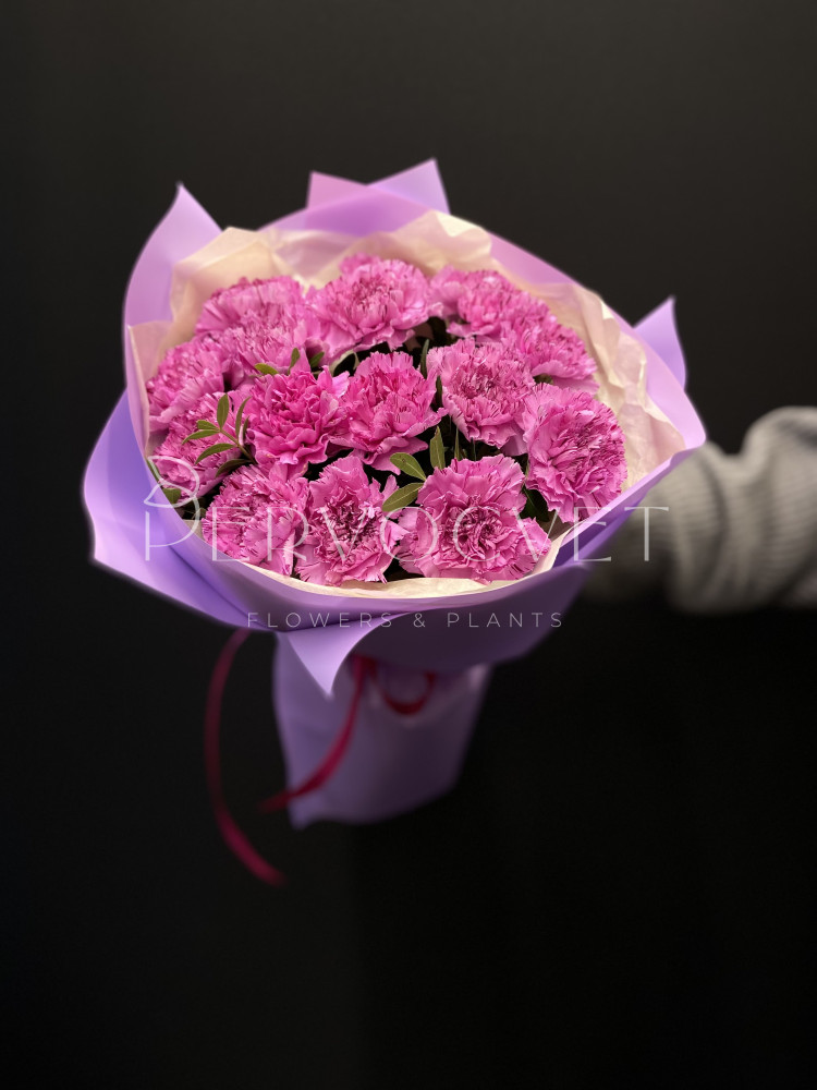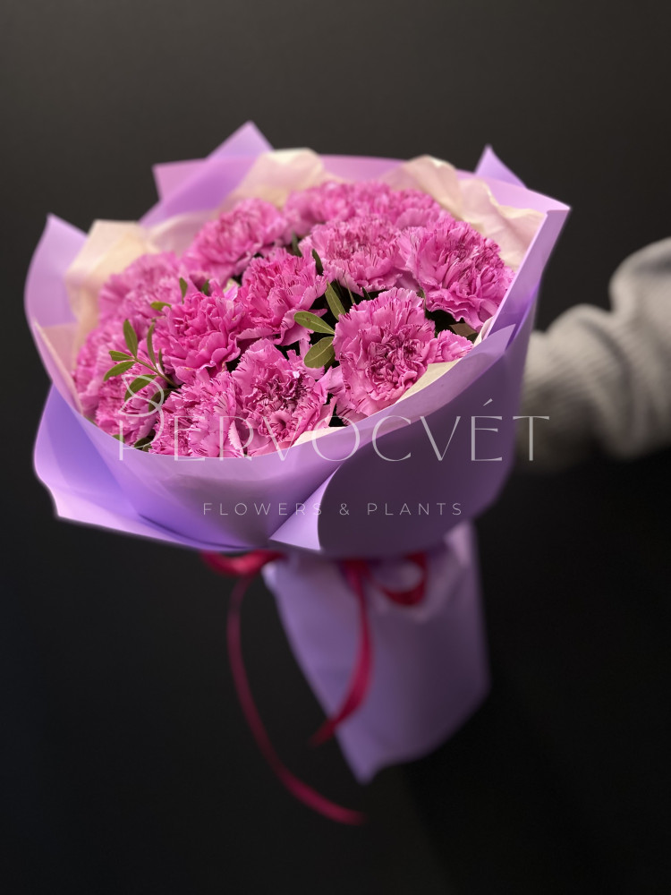 Букет из сортовых гвоздик (диантусов) цвета фуксии - самый стойкий вид цветка, который будет радовать долгое время!