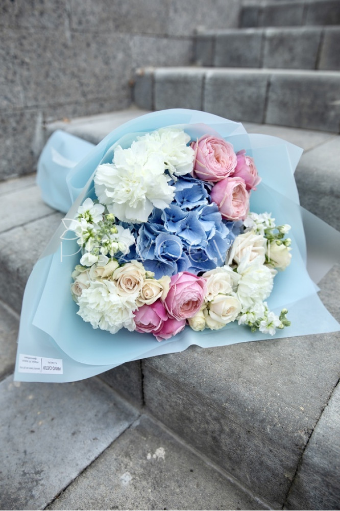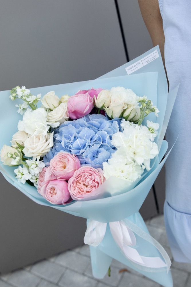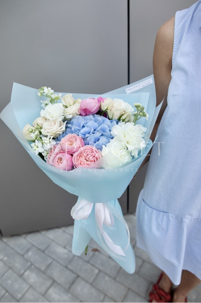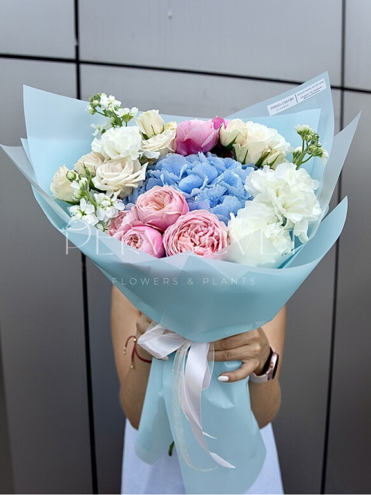Нежнейший букет с гортензией в обрамлении более чем пяти видов/сортов цветка: кустовые розы, в т.ч. пионовидные, диантусы, матиолла! Шикарное сочетание в любимой всеми розово-голубой гамме.