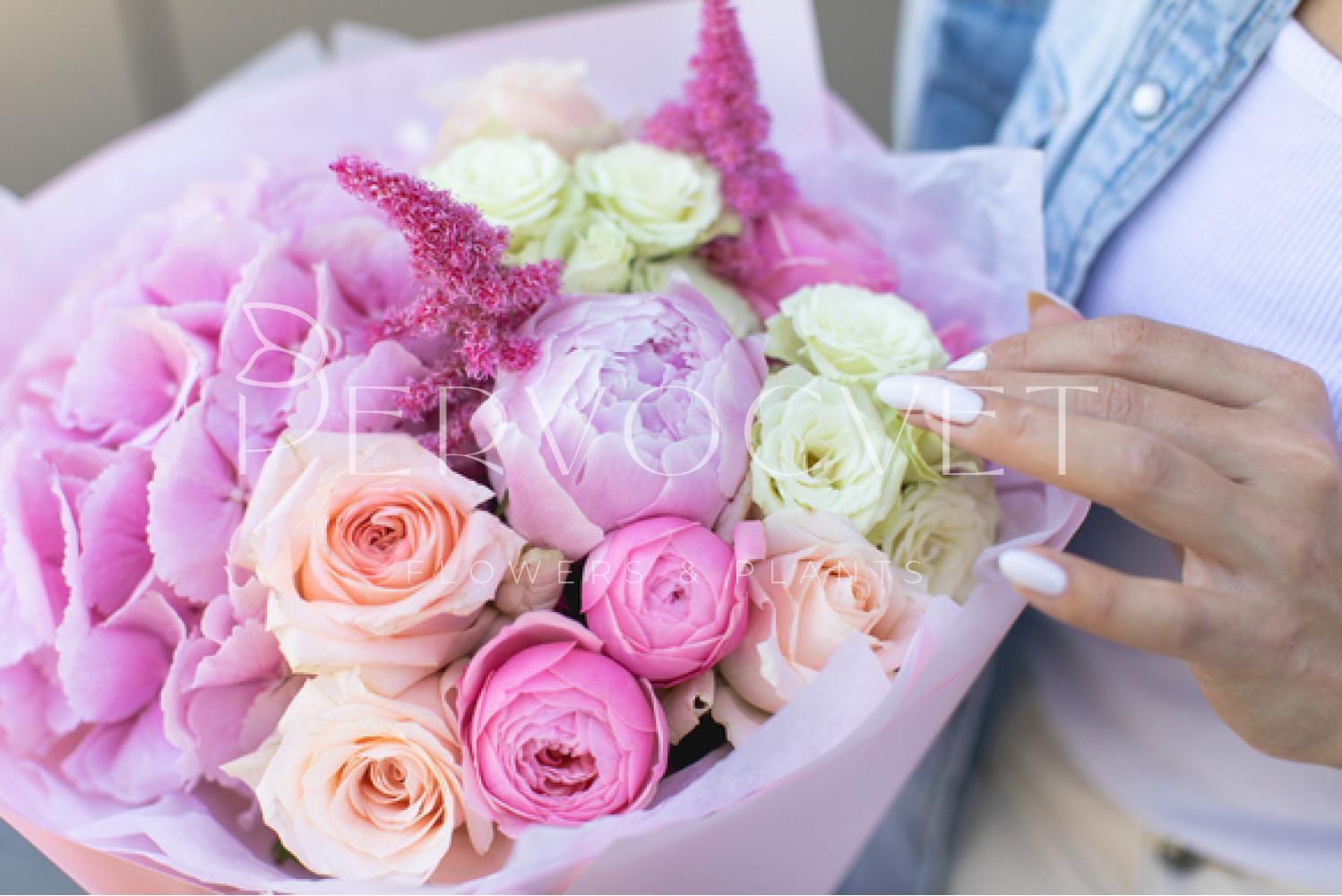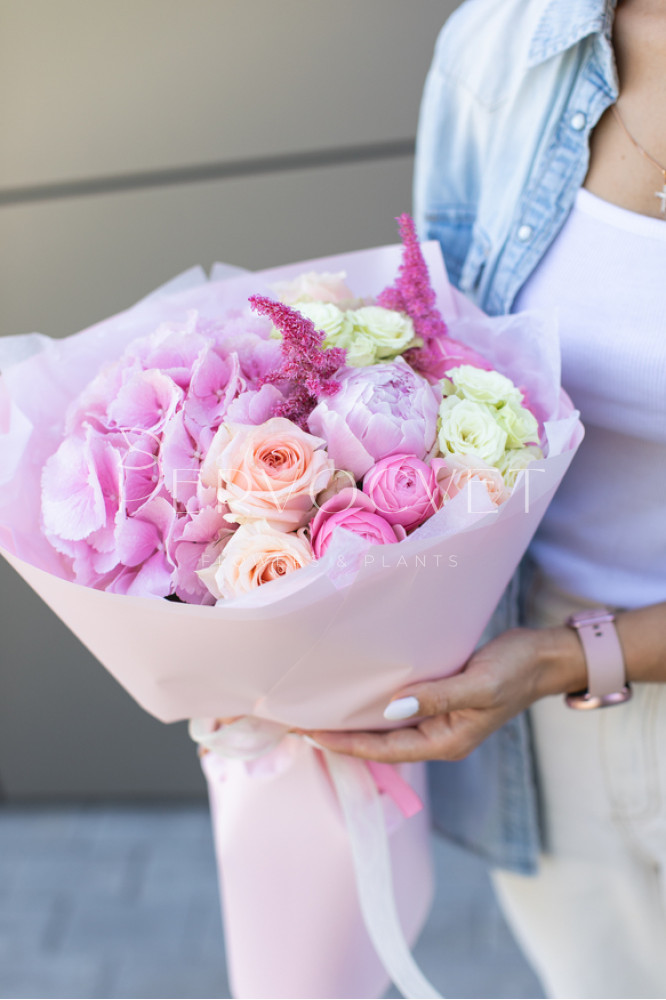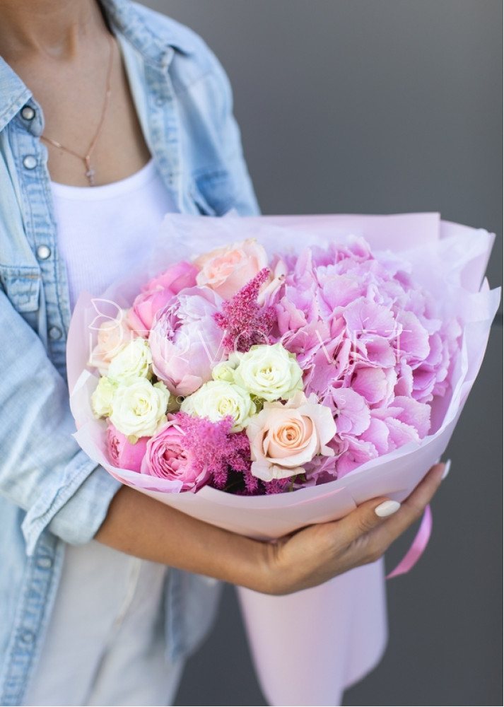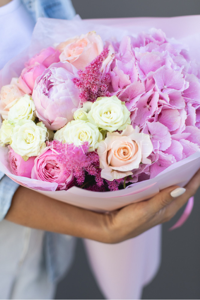 состав: гортензия, пион, пионовидная роза Сильва Пинк, кустовая роза, роза, астильба