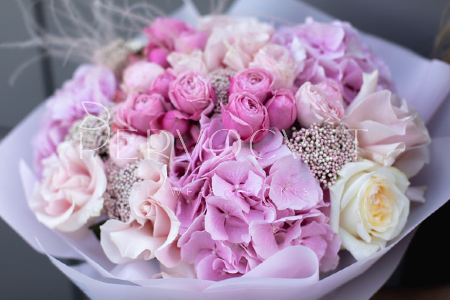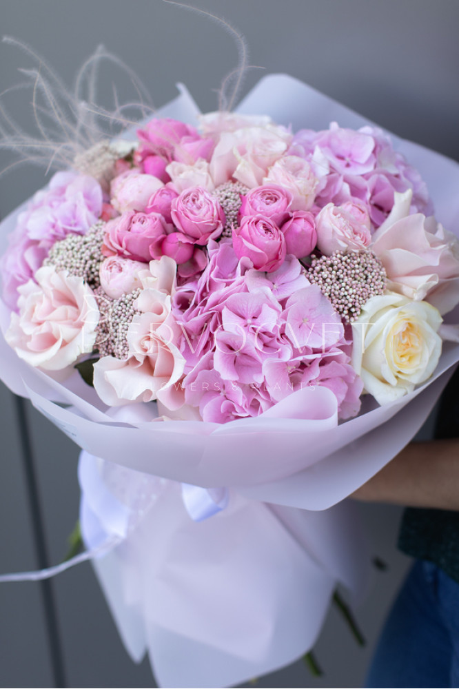 состав: гортензия 3, французская роза 5, пионовидная роза 2, пионовидная кустовая роза 6, озотамнус 5, стипа