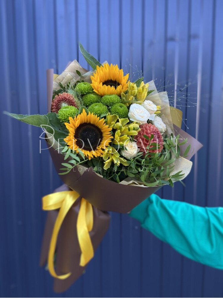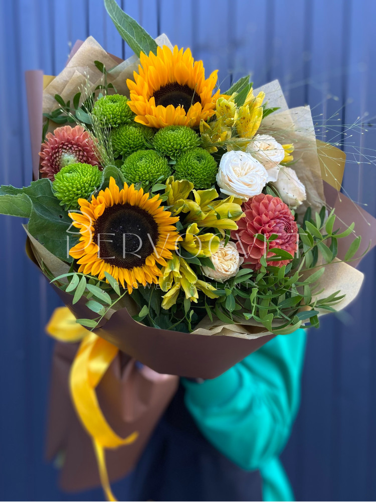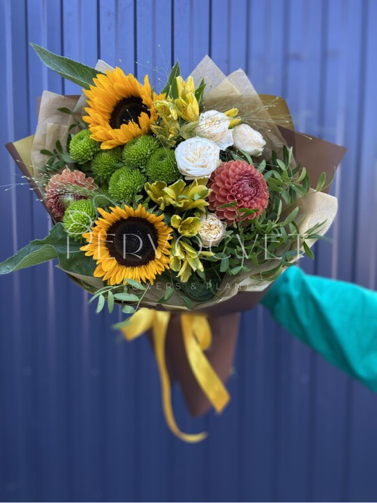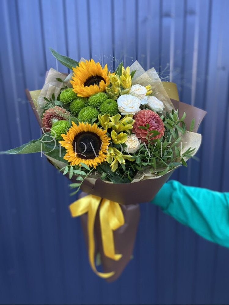 состав: подсолнух, альстромерия, хризантема, георгин, кустовая пионовидная роза Джентл Трендсеттер, паникум, фисташка