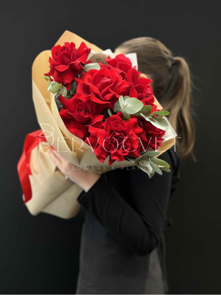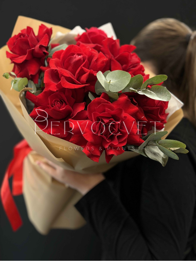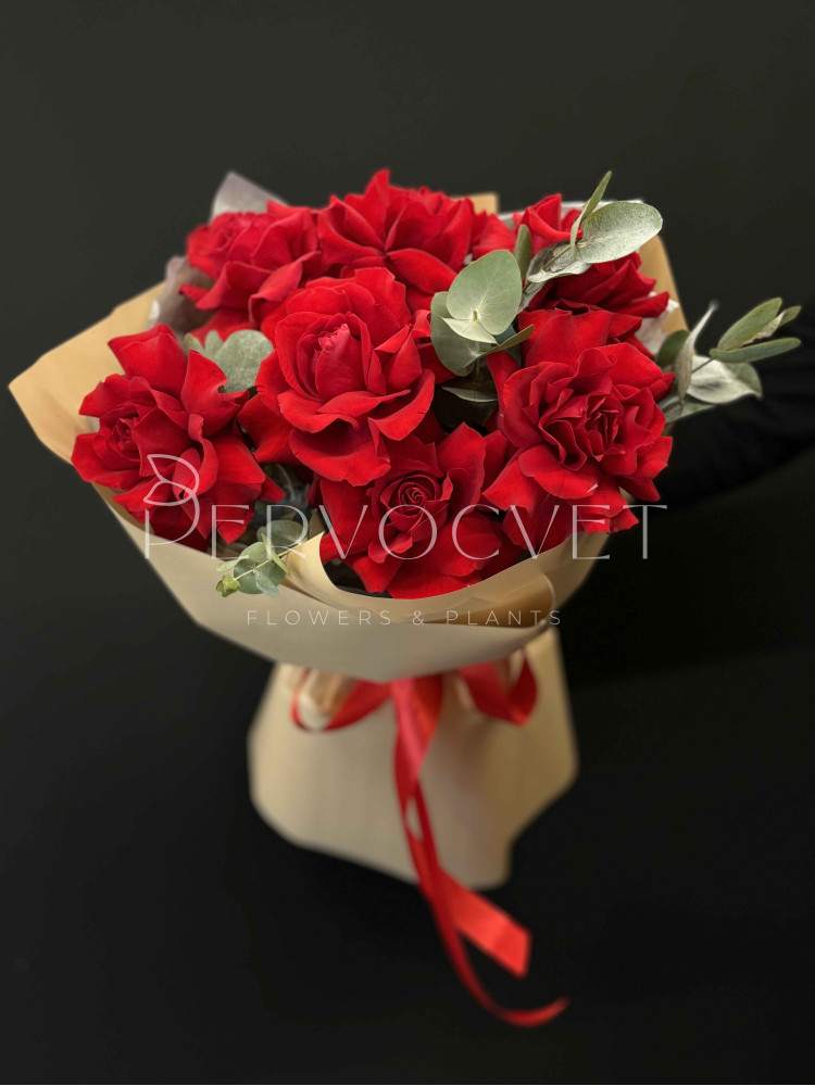 На фотографии букет из 7 роз с эвкалиптом размера.