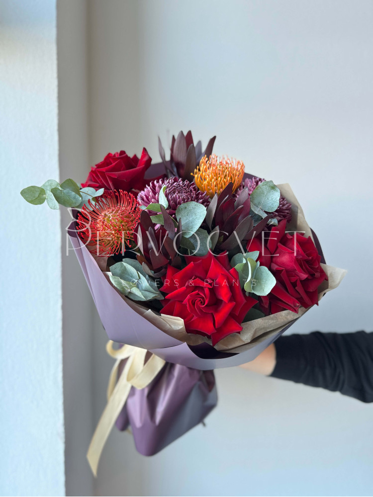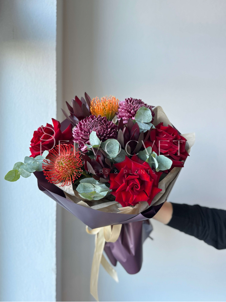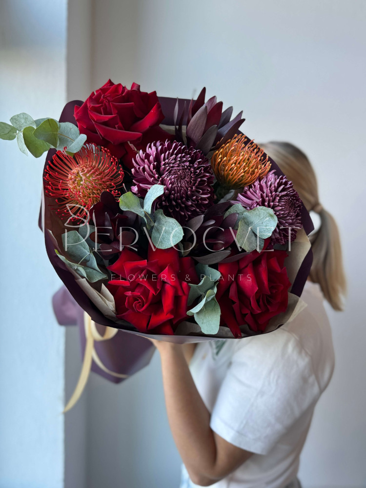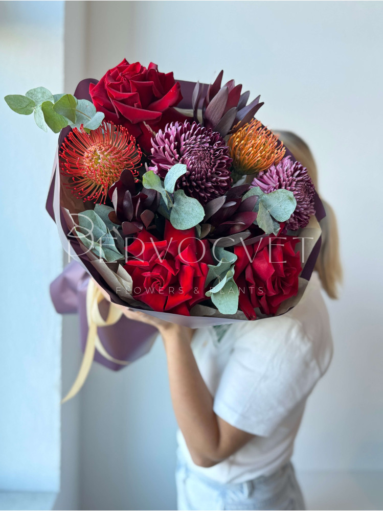 Осенний букет в оттенках ярких багровых листьев деревьев в этом сезоне. Хризантема в оттенке бордо, красная роза и фактурные акценты, с редким цветком леукоспермума. Букет ярких красок, стойкий - будет дарить радость каждое следующее утро.
