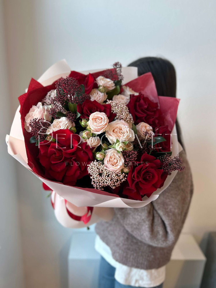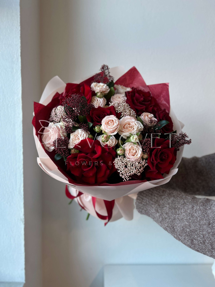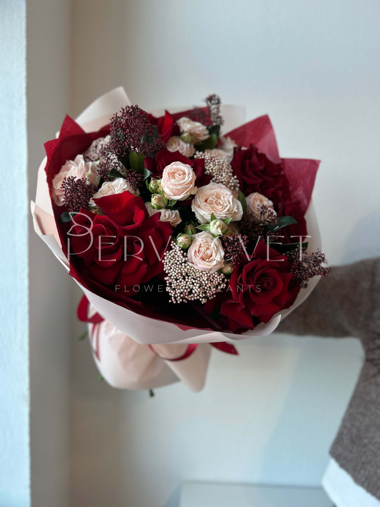 состав: французская роза 4, роза Эквадор 5, кустовая роза 3, озотамнус 3, скиммия, фисташка (тех.зелень)