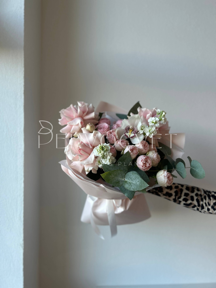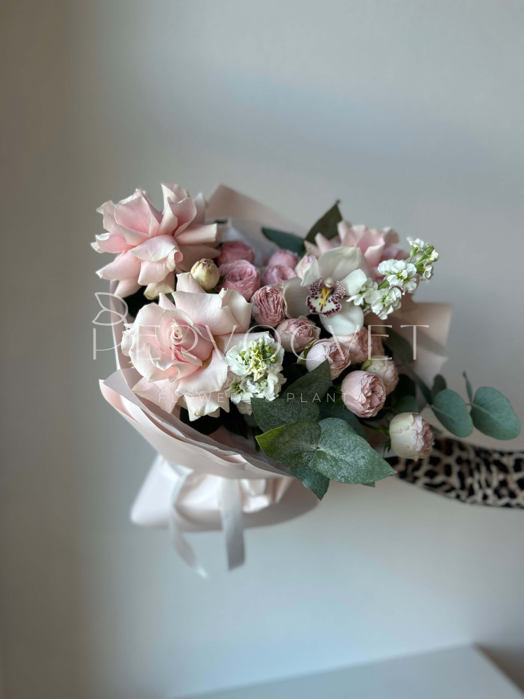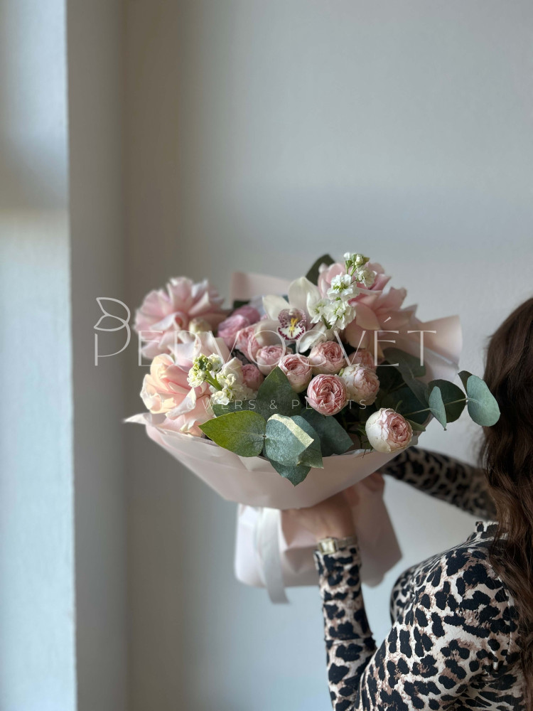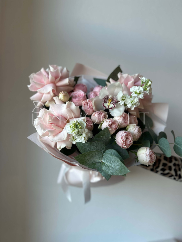 Нежный букет классического сочетания роз и орхидей в современном стиле: с удивительной французской розой сорта Пинк Мондиаль, кустовыми пионовидными розами нежного оттенка Менсфилд Парк, ароматной маттиолой и орхидеями сорта Цимбидиум белого цвета, с веточками серо-зеленого эвкалипта. Утонченные оттенки в единой композиции!