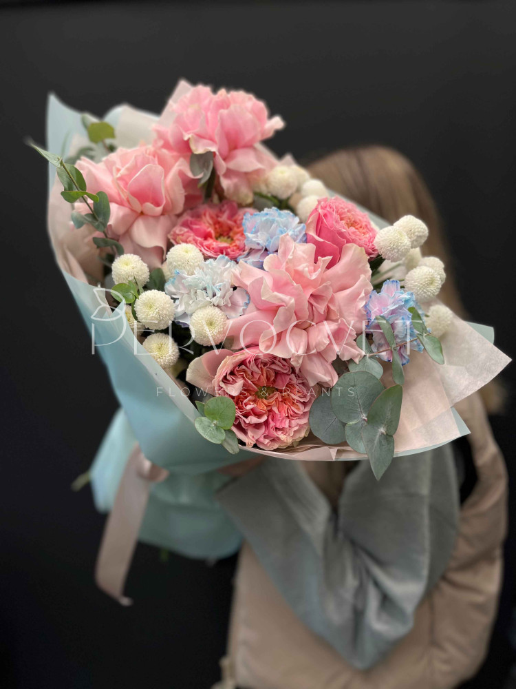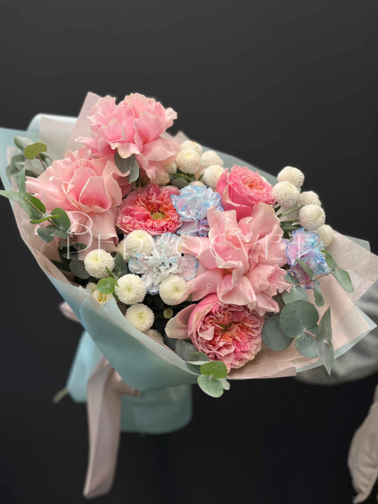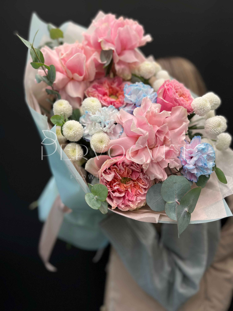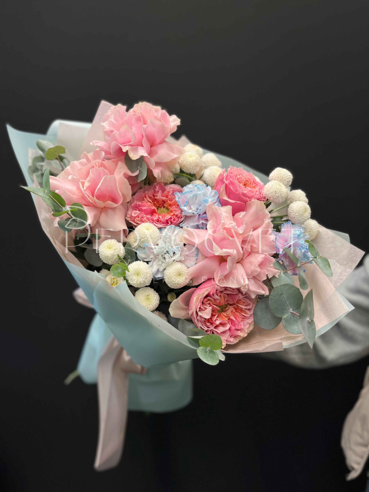 Розово-голубое безумие из пионовидных и французских роз, хризантемы Ньютон и редких диантусов Молли БаблГам - красивое нежнейшее весенне-летнее сочетание!
