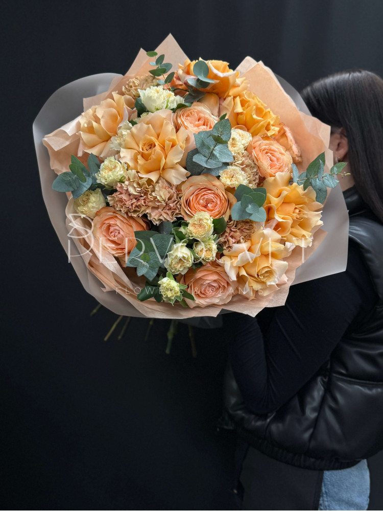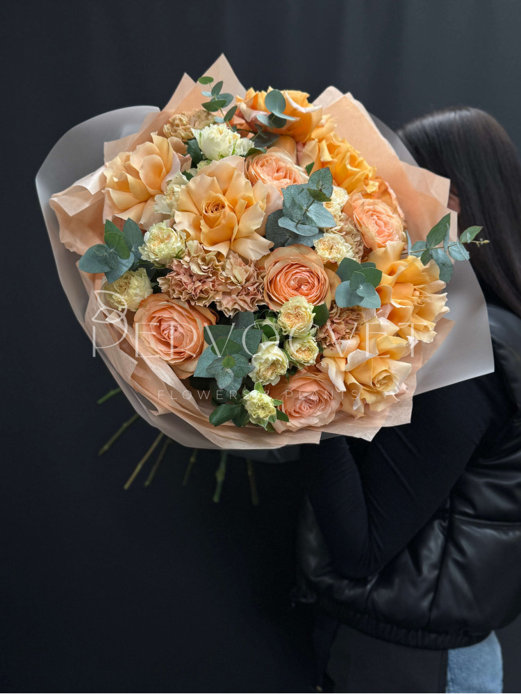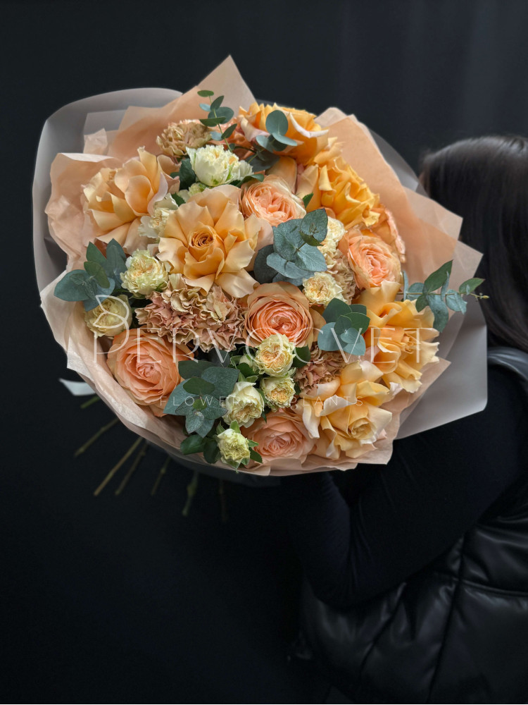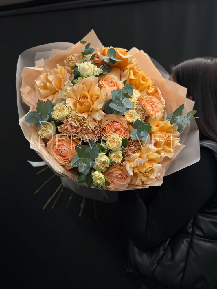 "Дорогие" персиковые оттенки, настоящий закат, шампанское или любая подходящая ассоциация! Наша изюминка - французская роза, многослойная пионовидная роза, сортовые фактурные диантусы и кустовая пионовидная роза сорта Джентл Трендсеттер. Очень красивые оттенки и фактуры, смелое сочетание, которое не оставит равнодушной!