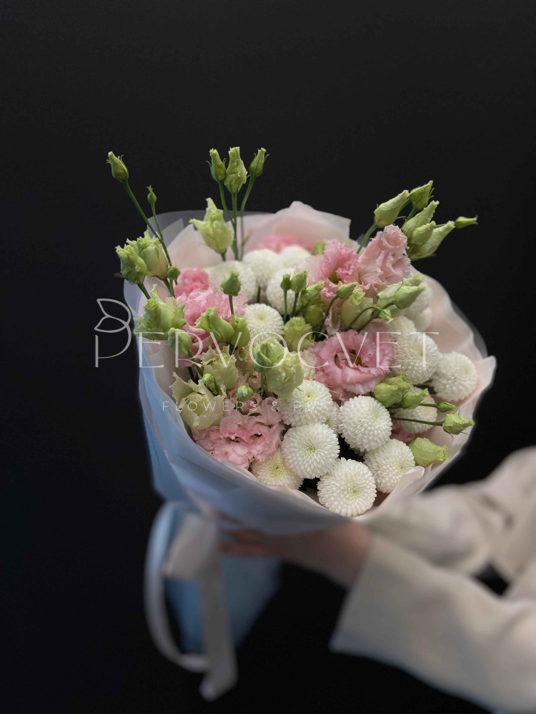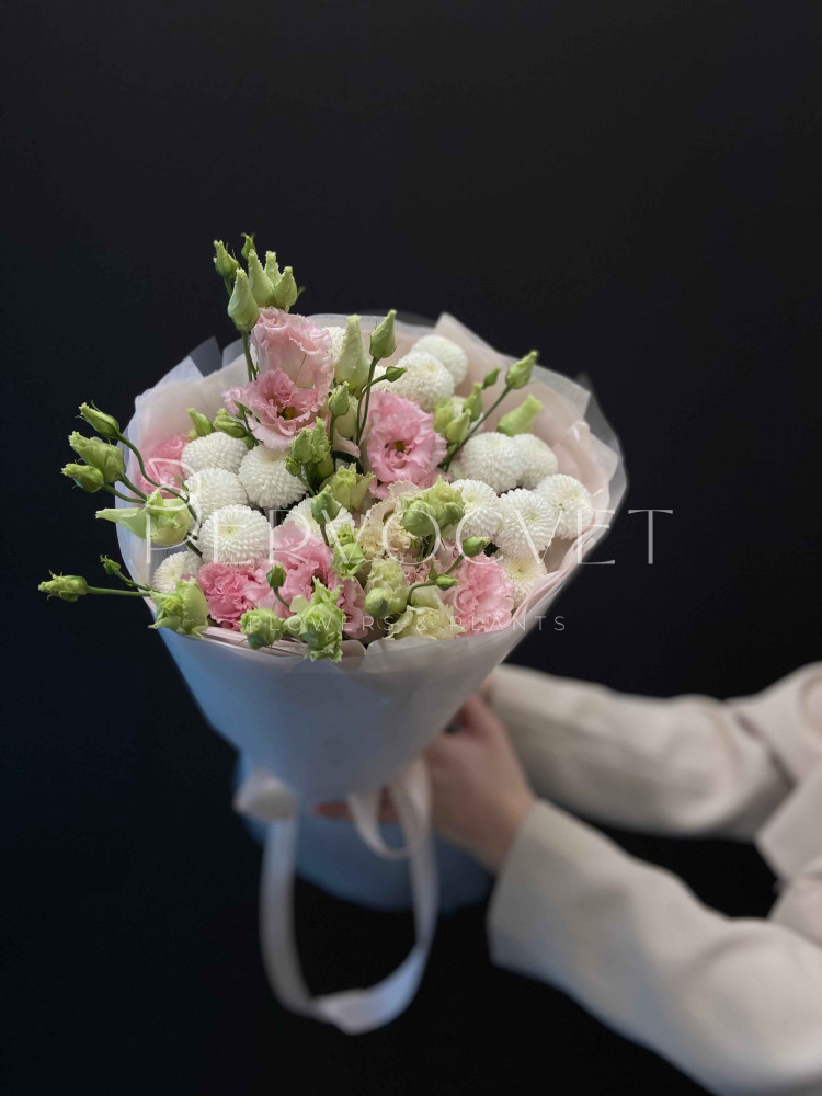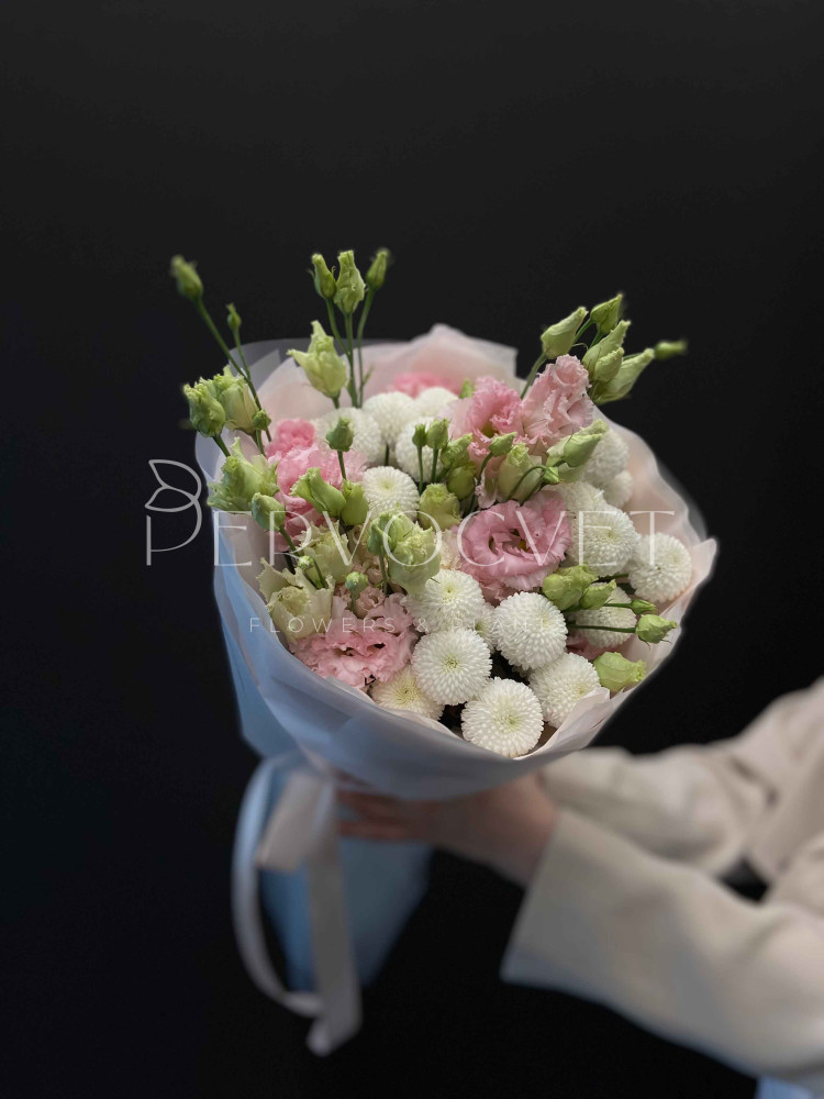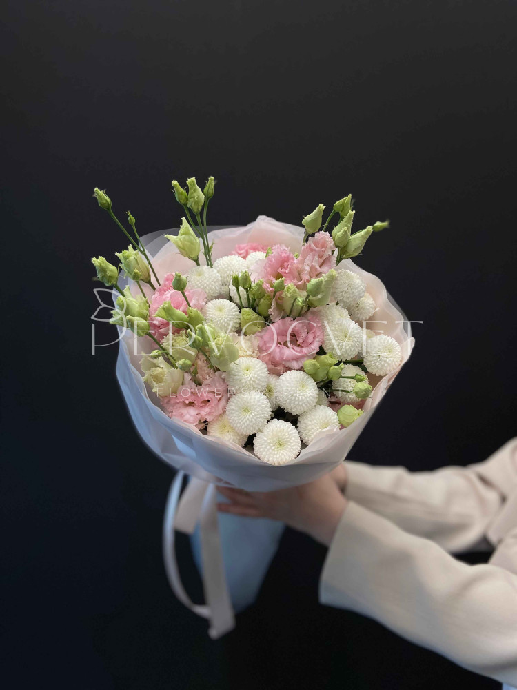Стойкий букет для дома, супер-вариант букета, если вы идете в ресторан/кафе на свидание, на долгую прогулку или мероприятие. Хризантемы и эустомы, самые стойкие цветы, а в этом букете собраны еще красивые редкие сорта: Ньютон хризантема и розовая эустома Алисса Пинк - красиво и нежно. Но конечно, чем быстрее цветы окажутся в воде, тем лучше!