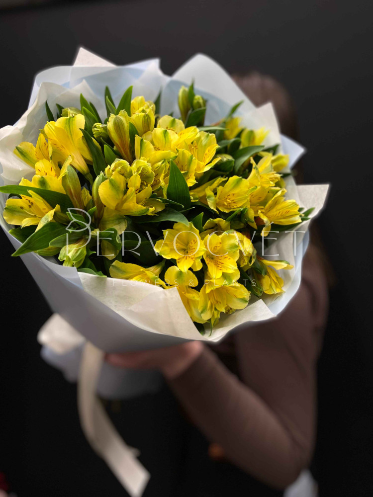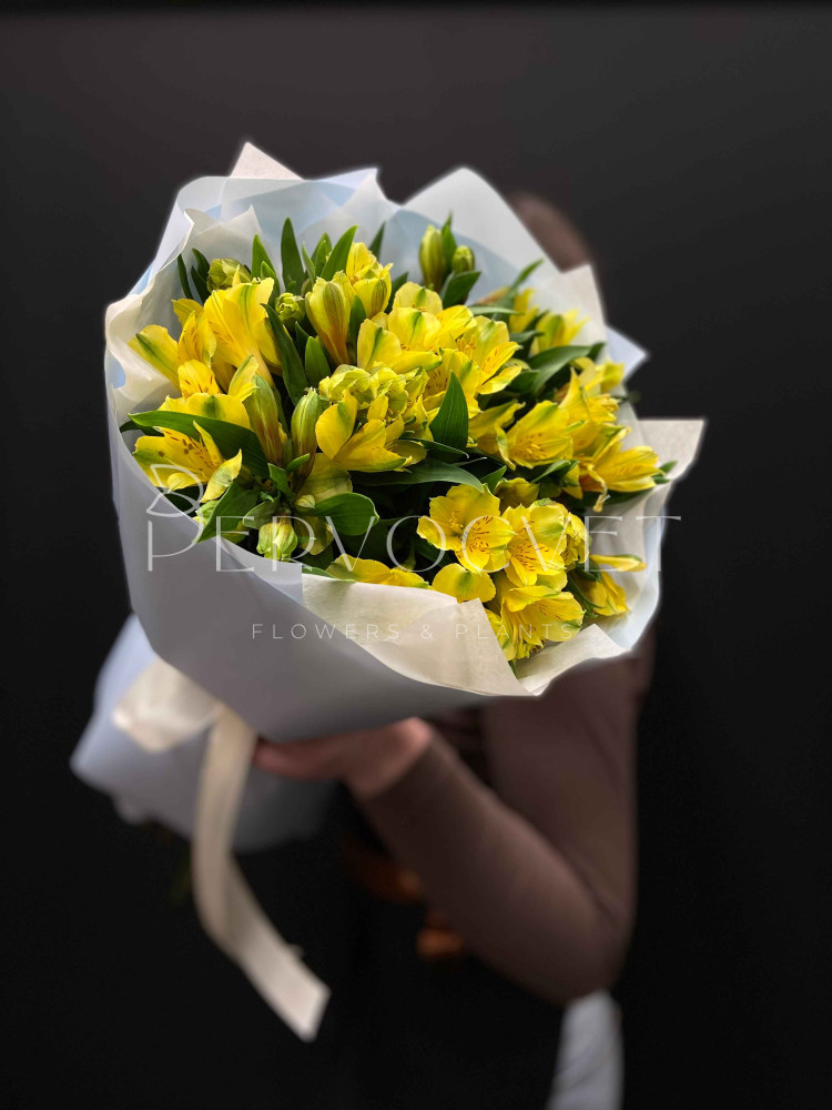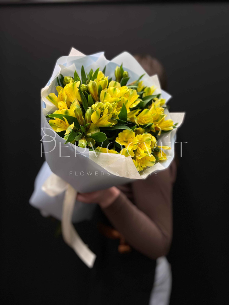 Моно-букет из "перуанских лилий", или альстромерий, яркого желтого цвета в объемной упаковке.