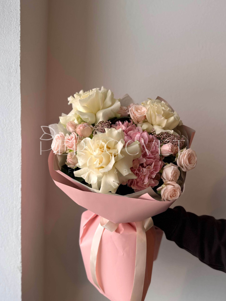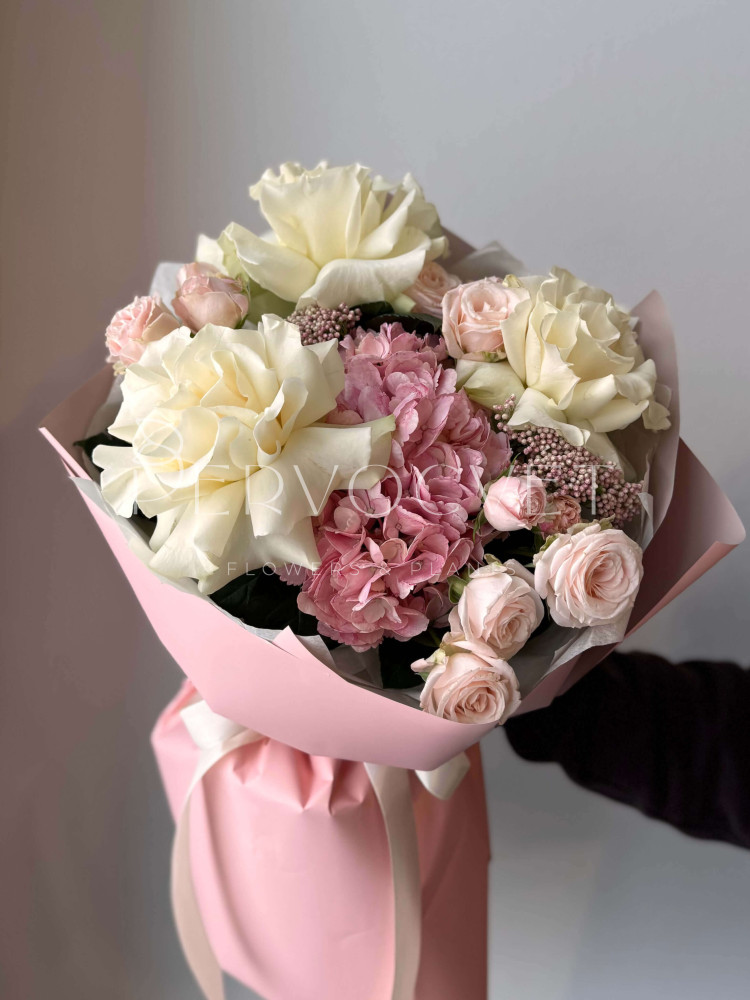 состав: гортензия Колумбия, французская роза, кустовая роза, озотамнус