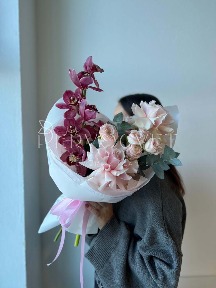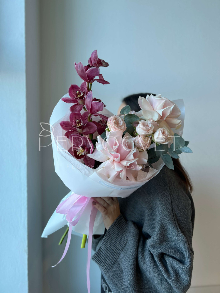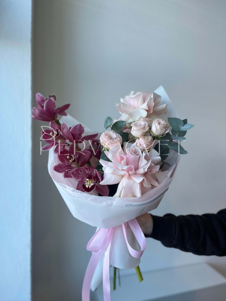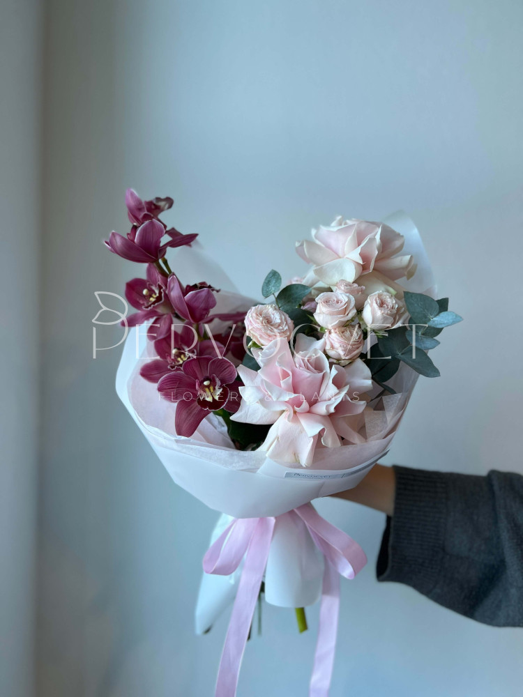 состав: роза французская, орхидея Цимбидиум, кустовая роза, эвкалипт