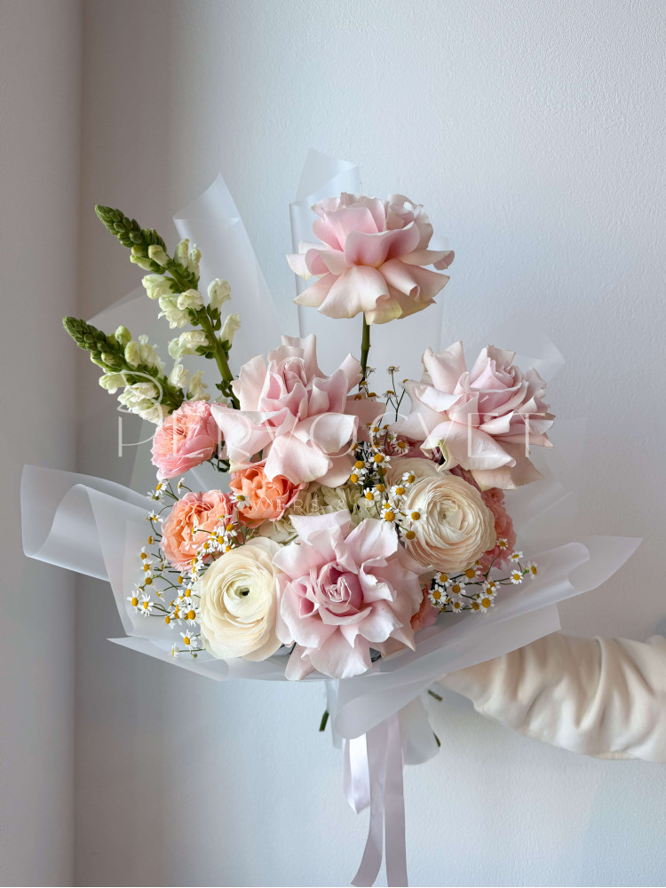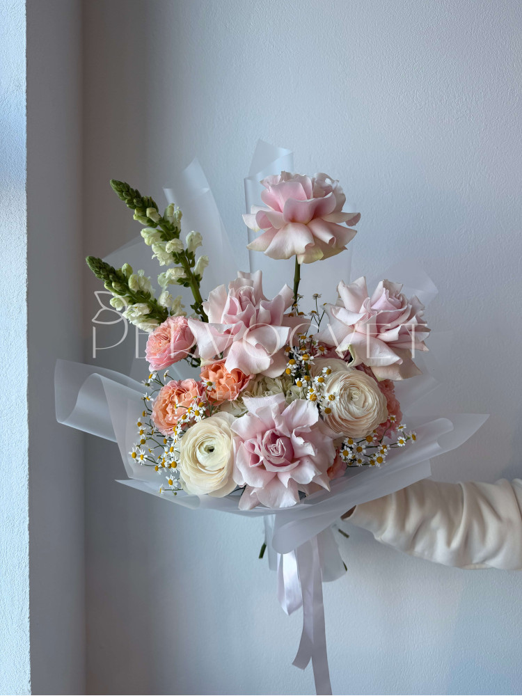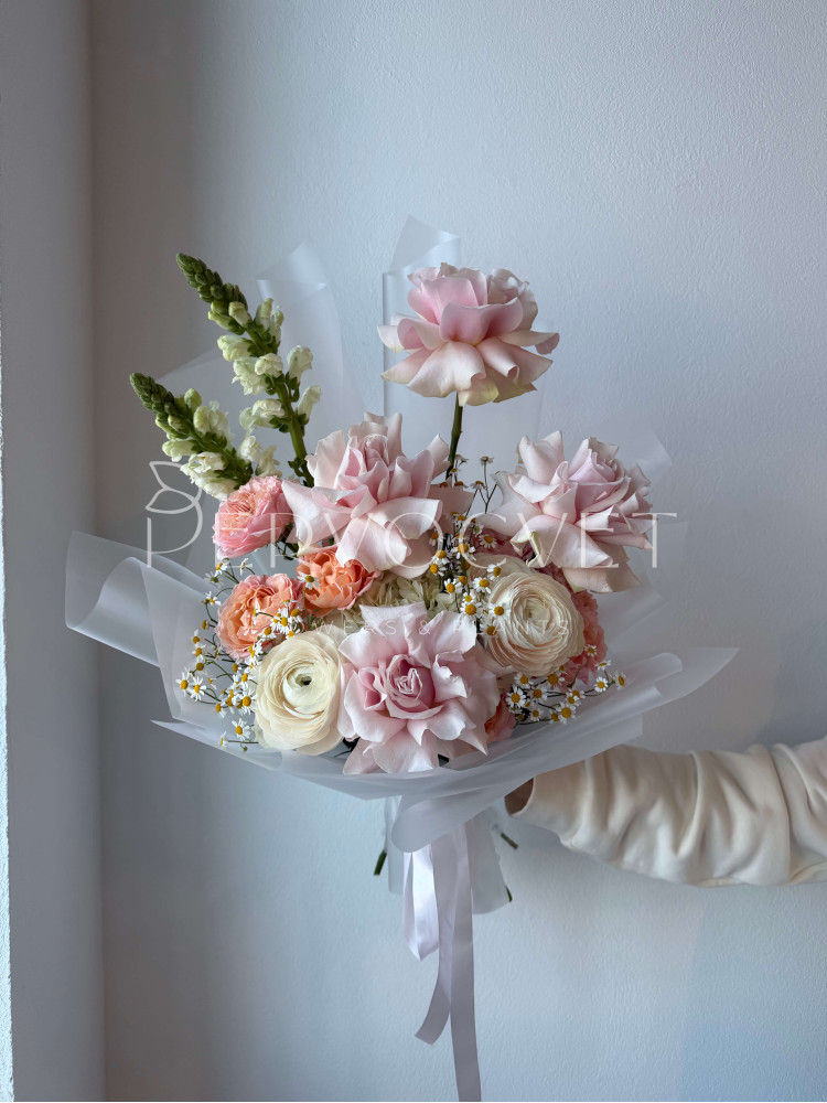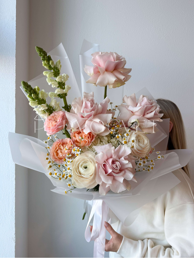 Оригинальная форма и воздушная сборка, чтобы подчеркнуть каждый цветок. Эффектный букет из французских роз, ранункулюсов, кустовых роза и львиного зева. Красиво подарить и красиво потом наслаждаться таким букетом в вазе!