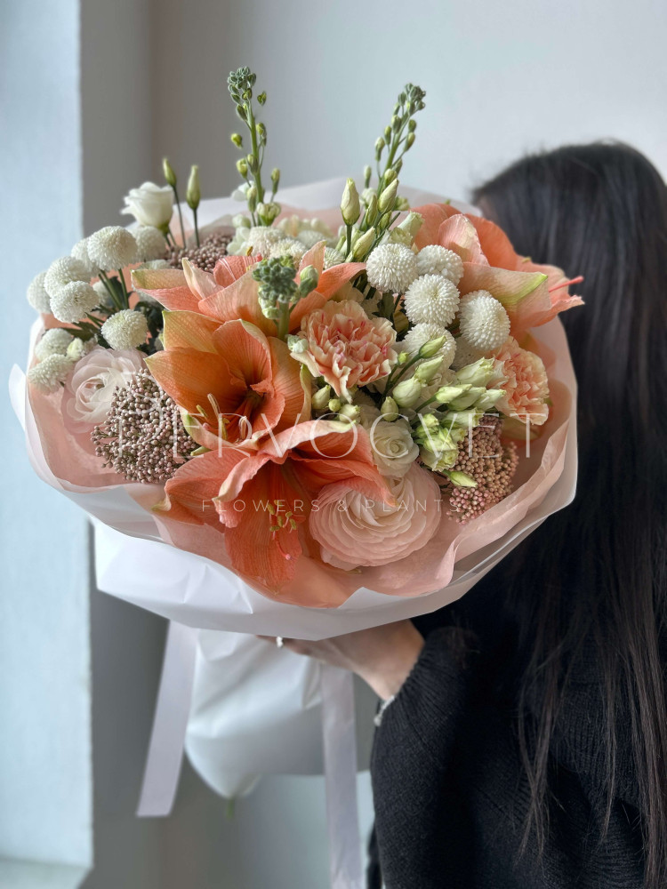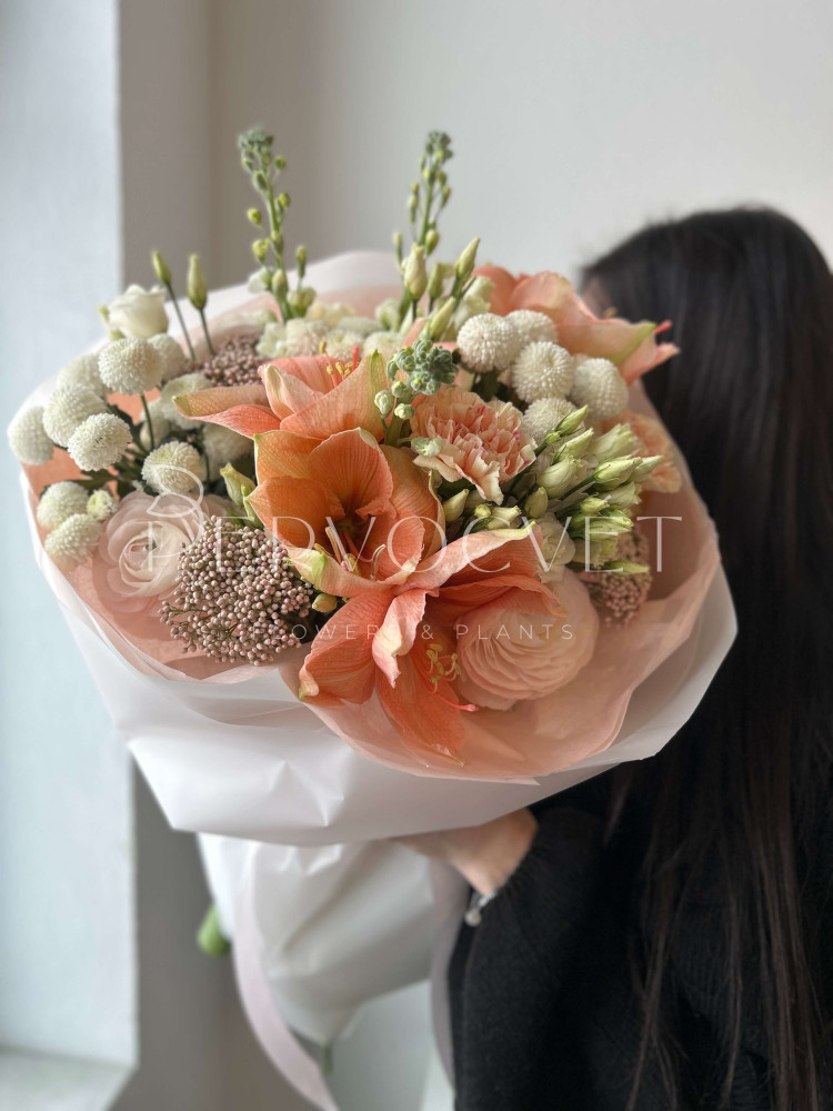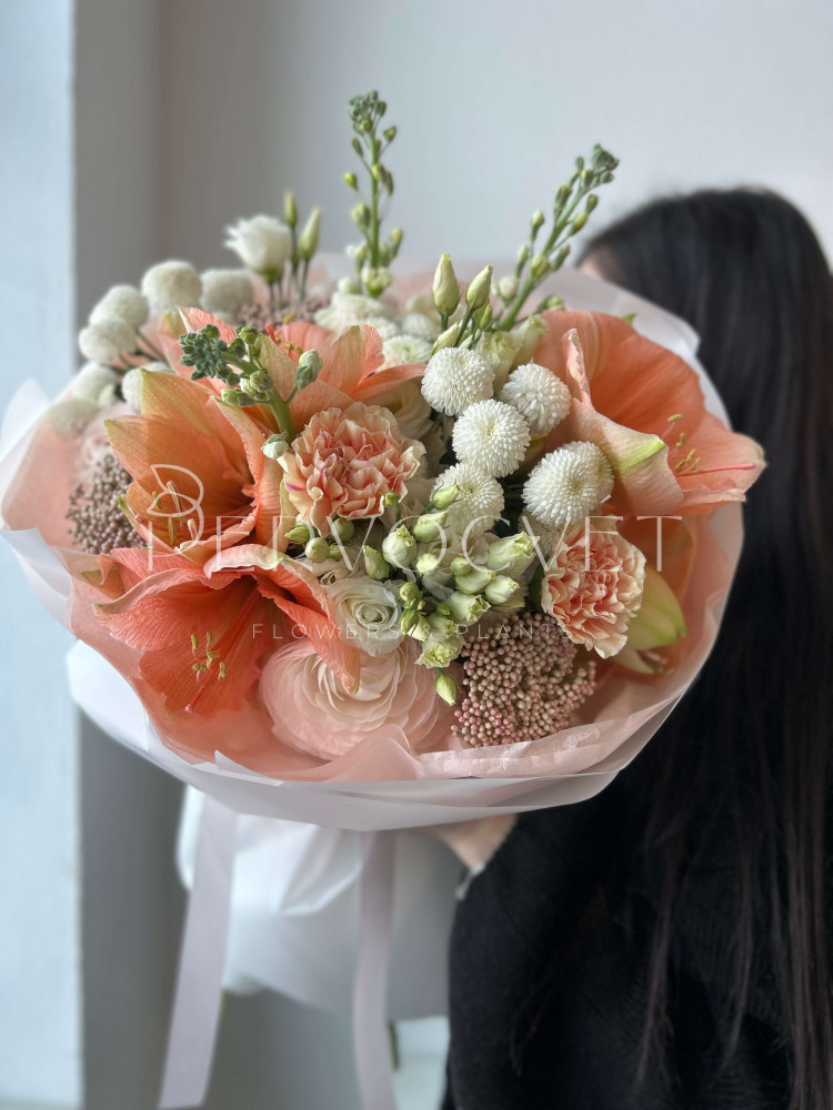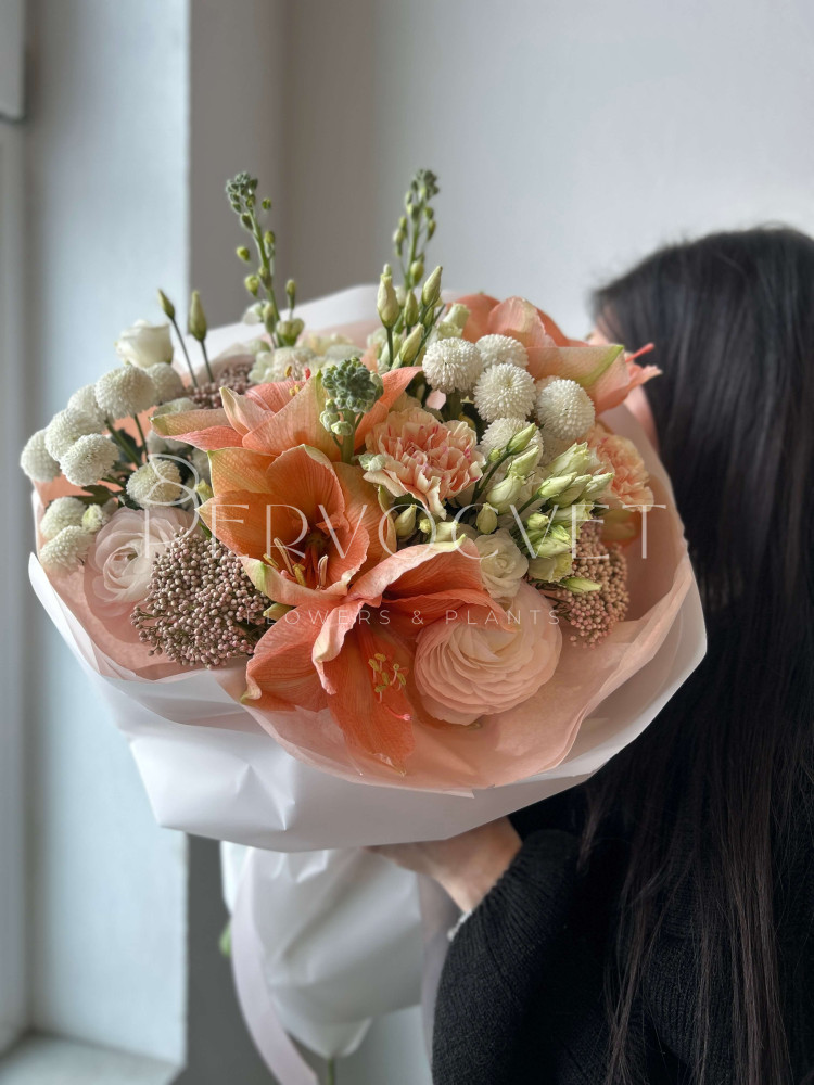 Первоцветы весны и зимние амариллисы в редком оттенке "розового персика". Уникальные фактуры и нежнейший цвет, букет создан, чтобы удивлять!