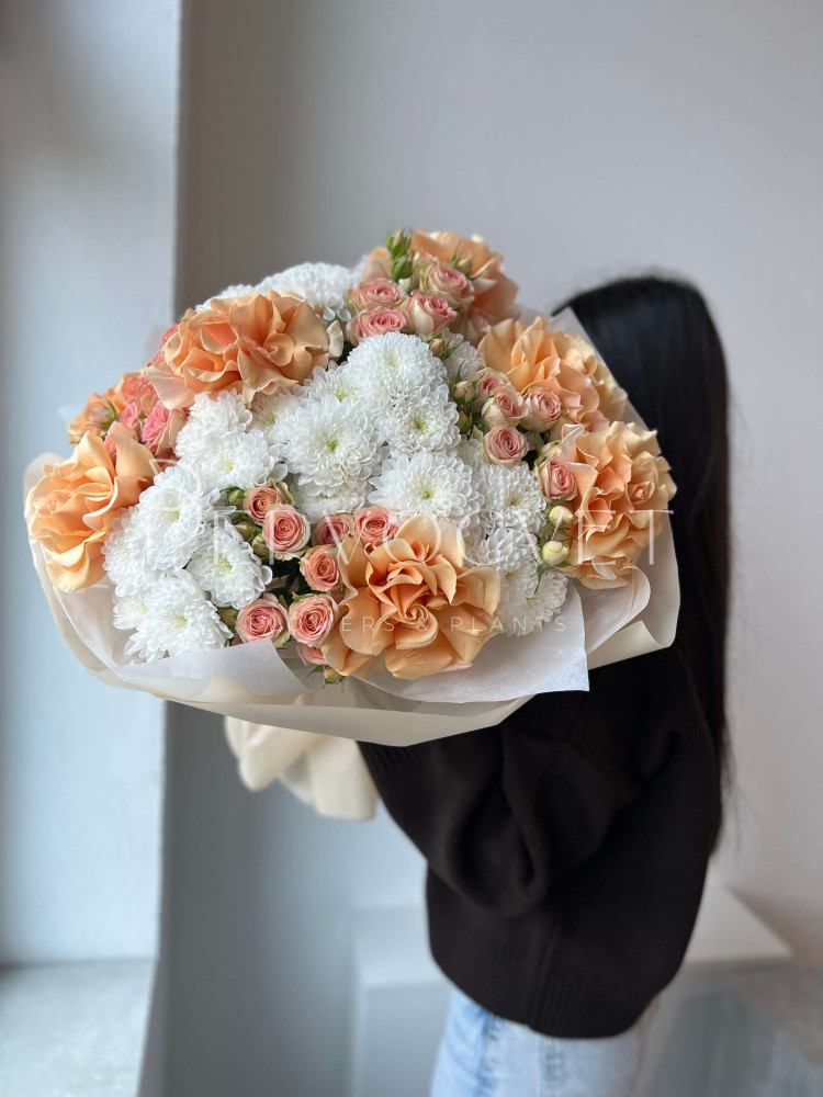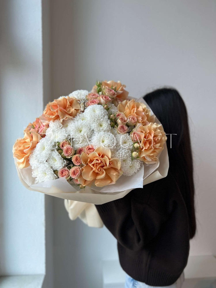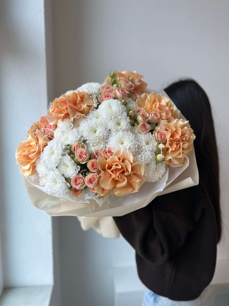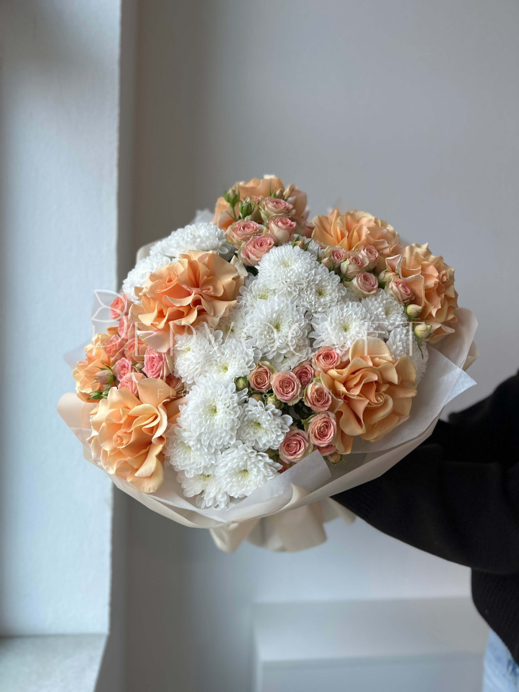 Нежное сочетание персиковых роз и белой хризантемы! Пышный букет красивых фактур: стойких кустовых хризантем, любимых французских роз и классических кустовых роз. Букет для важного повода, подойдет как близкому и любимому человеку, так и в качестве торжественного подарка коллеге.