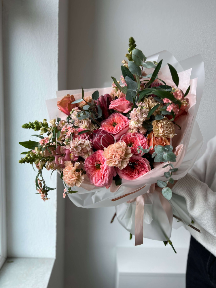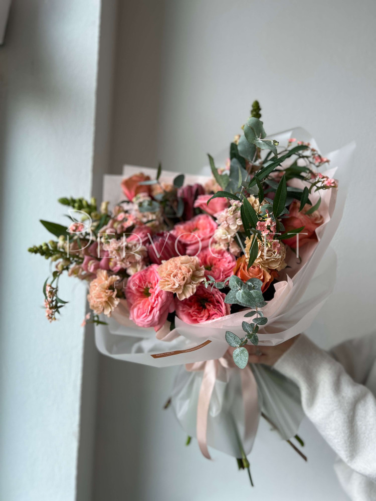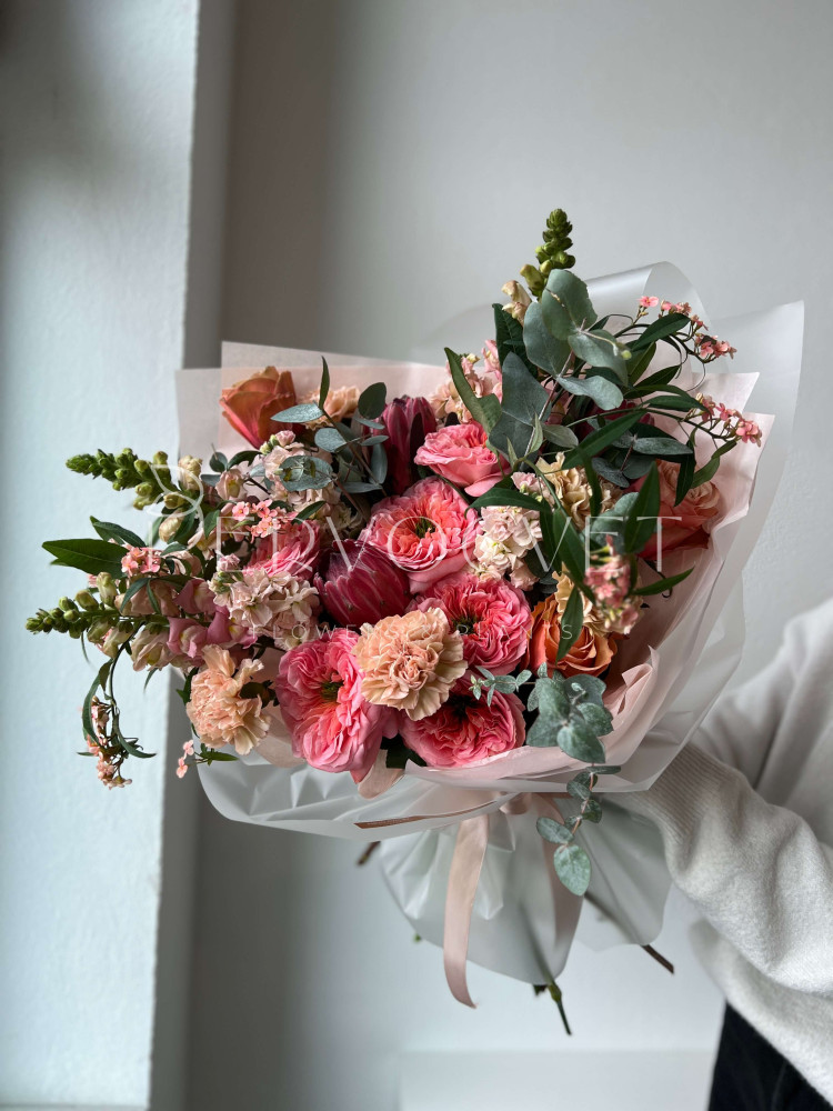состав: пионовидная роза 9, протея 3, гвоздика 5, антирринум 3, маттиола 5, эуфорбия 2, эвкалипт