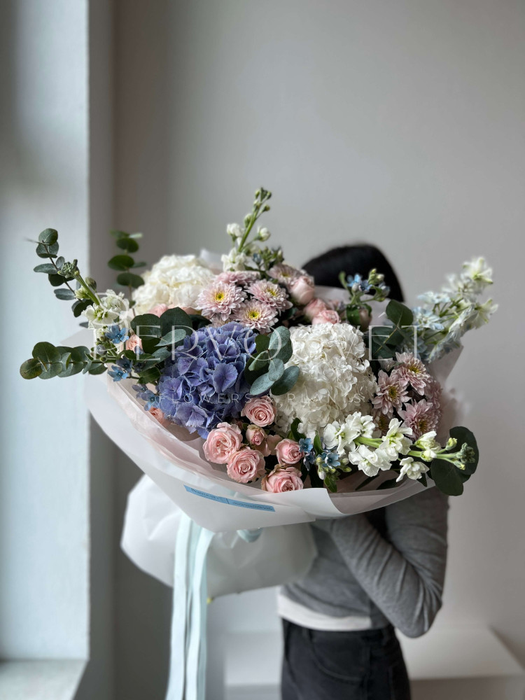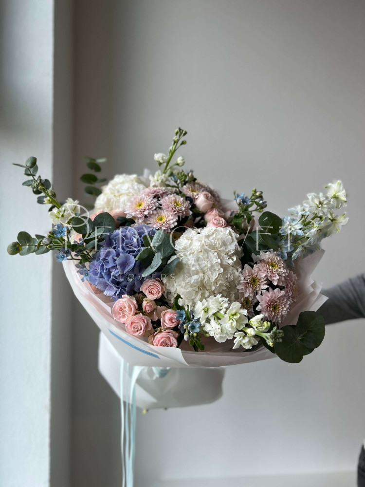 состав: гортензия импорт 3, маттиола 3, дельфиниум 1, оксипеталлум 4, хризантема 3, кустовая роза 3, эвкалипт
