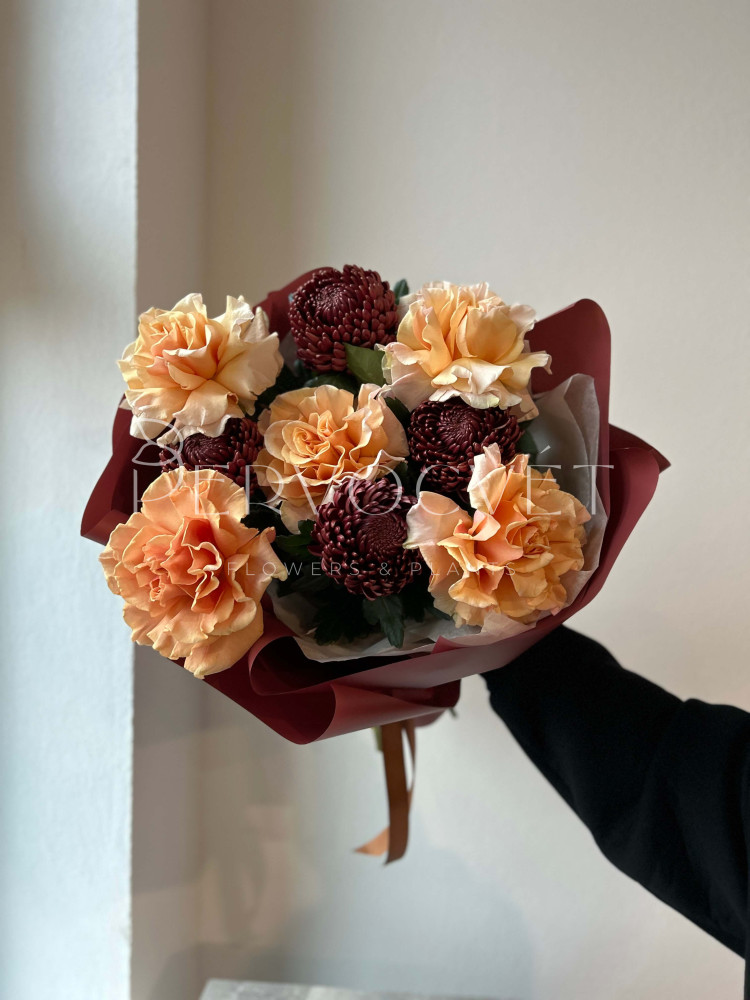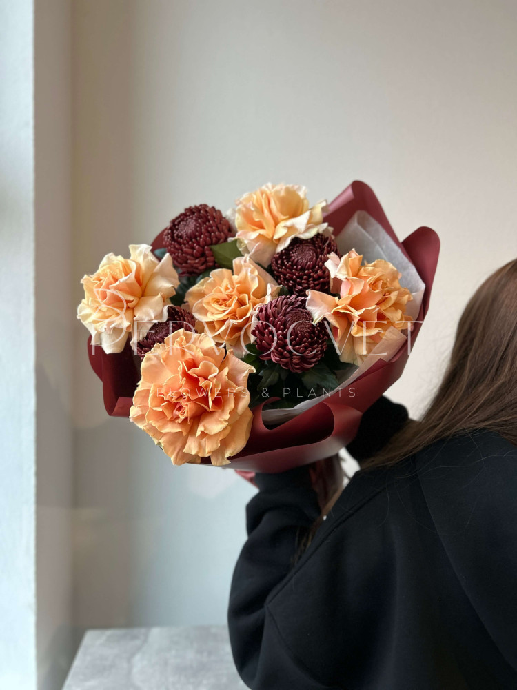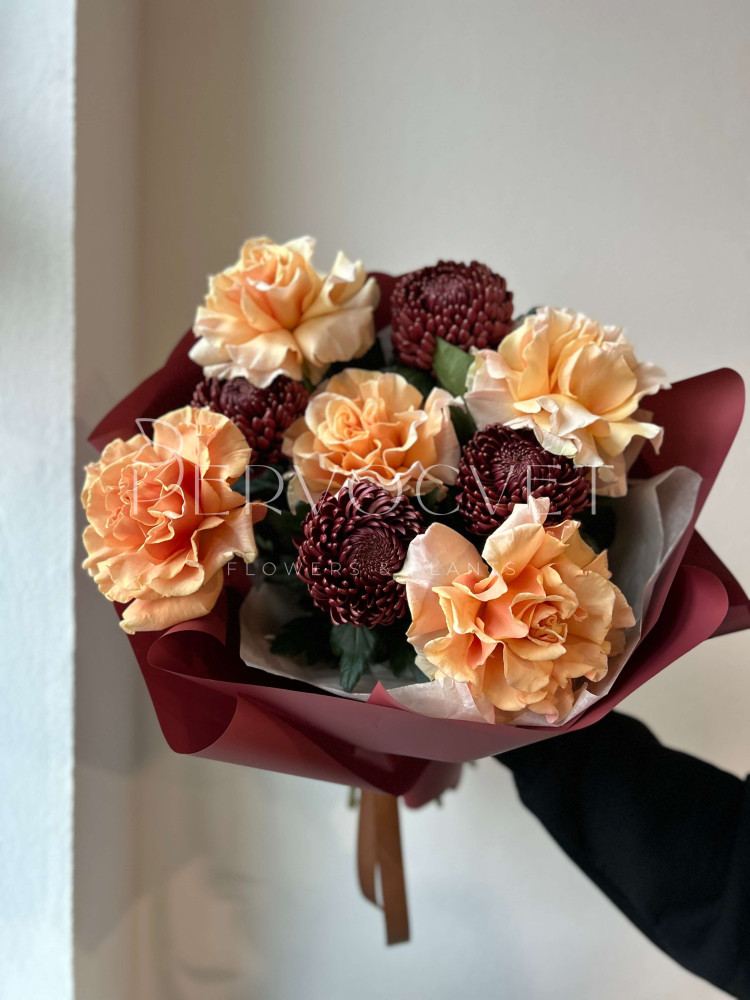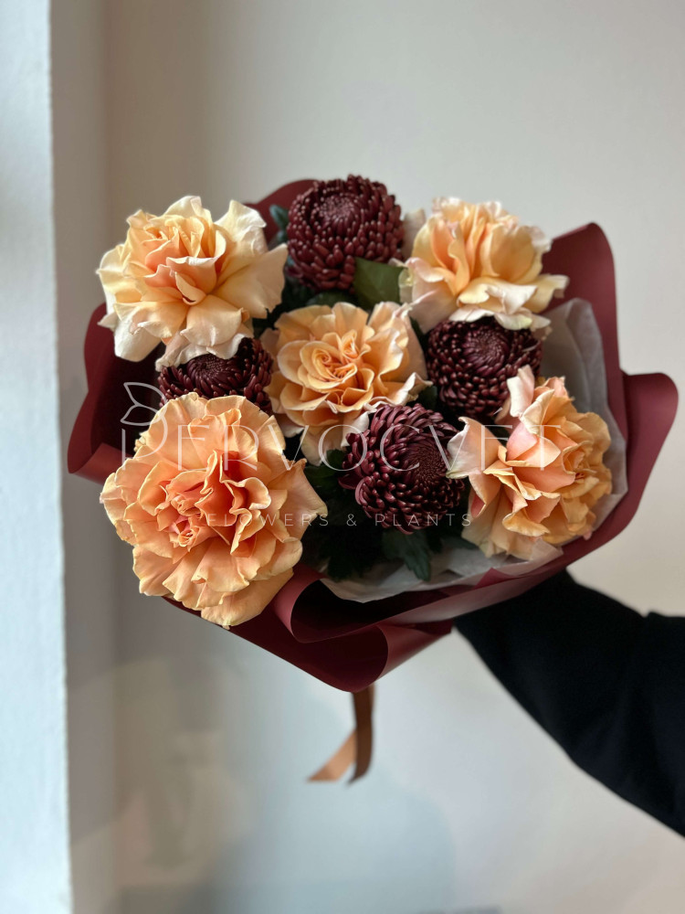Контрастные оттенки и уникальные сорта! Букет с редкой персиковой французской розой, которая всегда лимитирована, и самая востребованная хризантема, в оттенке вина сорта Бигуди! Букет сочный и вкусный - только для близкого человека.