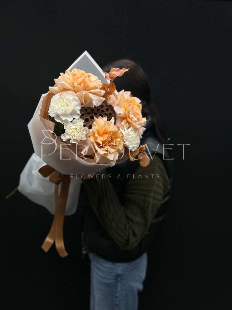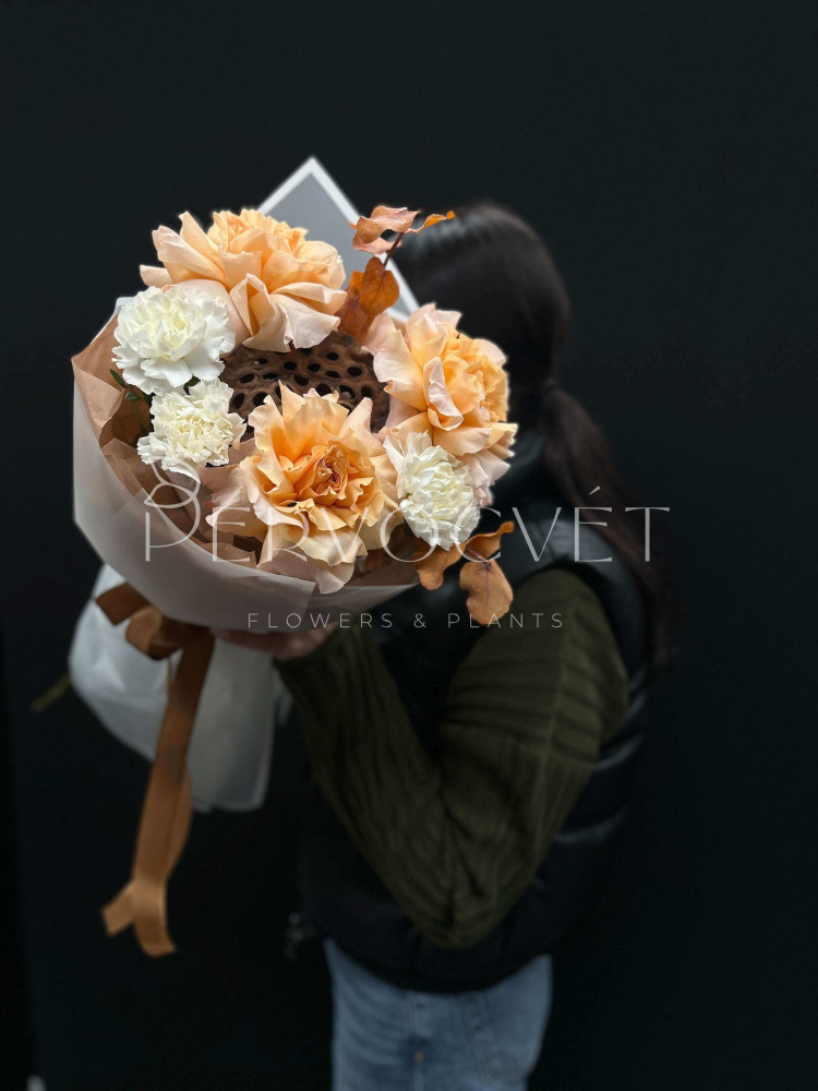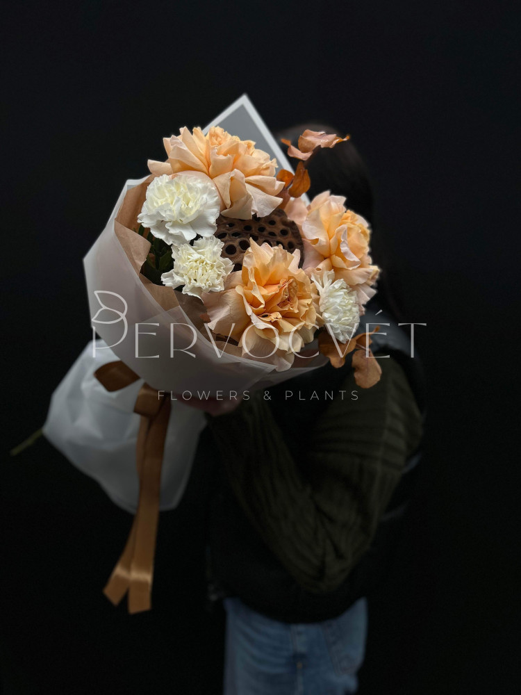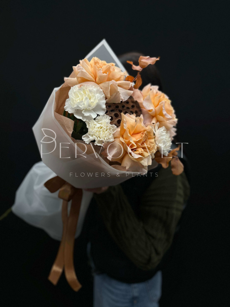 состав: французская роза, гвоздика, лотос сухоцвет, эвкалипт осенний, фисташка (тех.зелень)