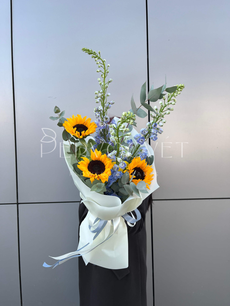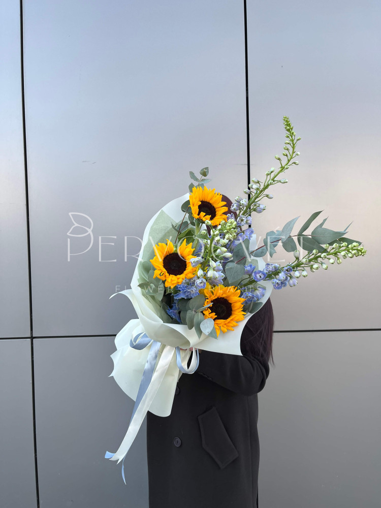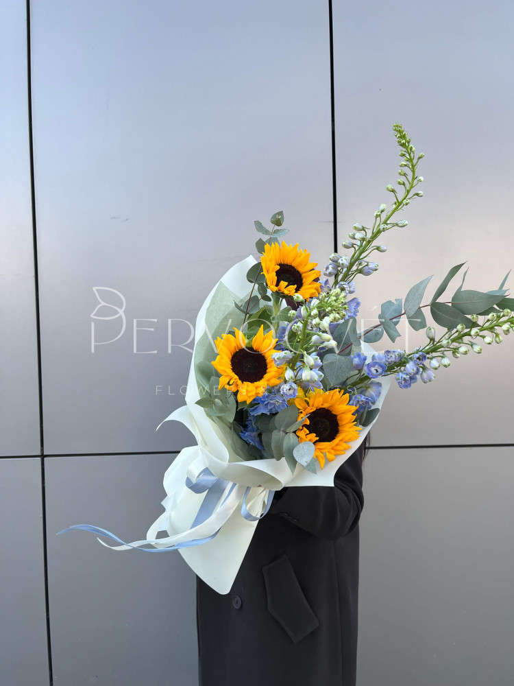 Солнечные подсолнухи и синий дельфиниум - такие разные оттенки и фактуры, но дополняют друг друга идеально! Этот букет ей точно понравится, и будет долго радовать в вазе. Лето, которое на солнышке еще красивее!