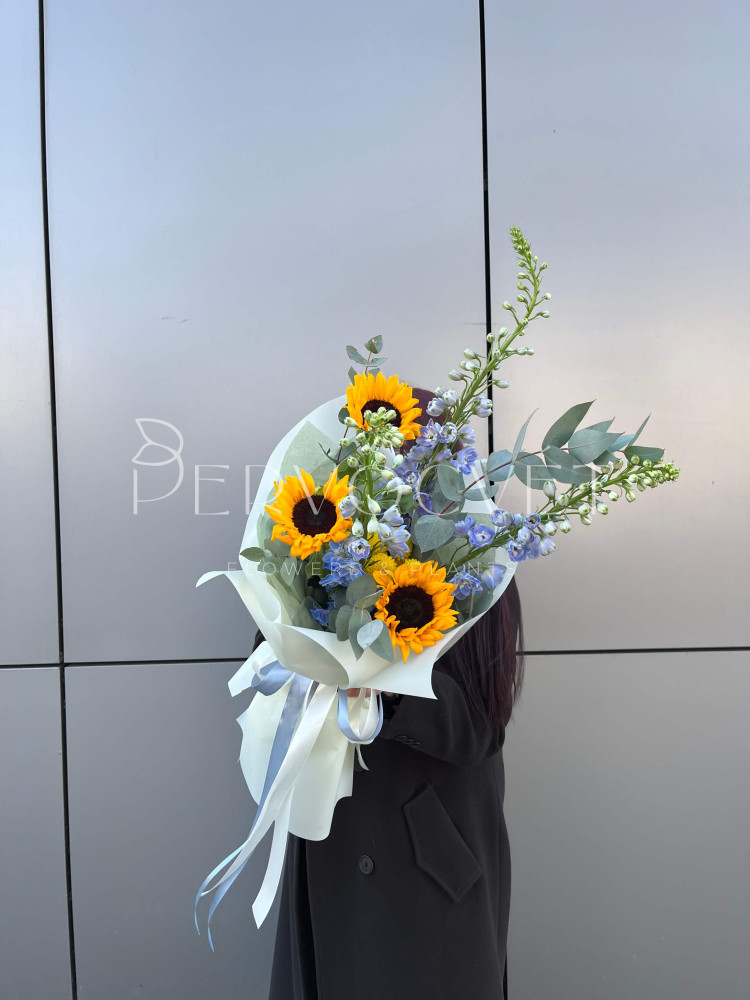 Букет #286 подсолнух и дельфиниум