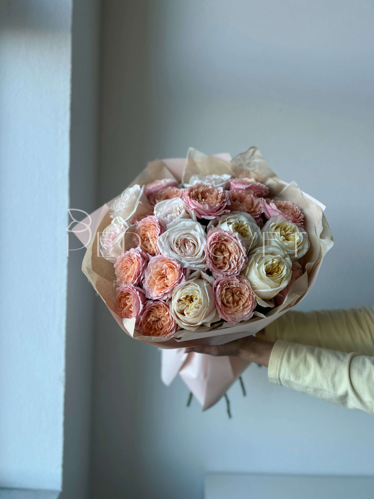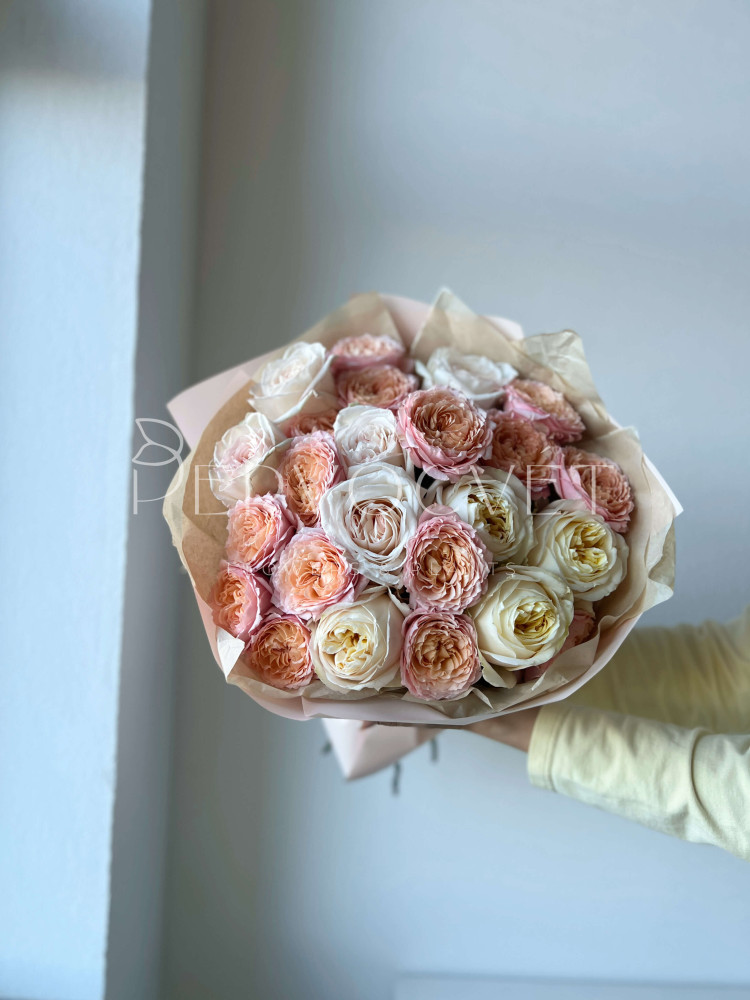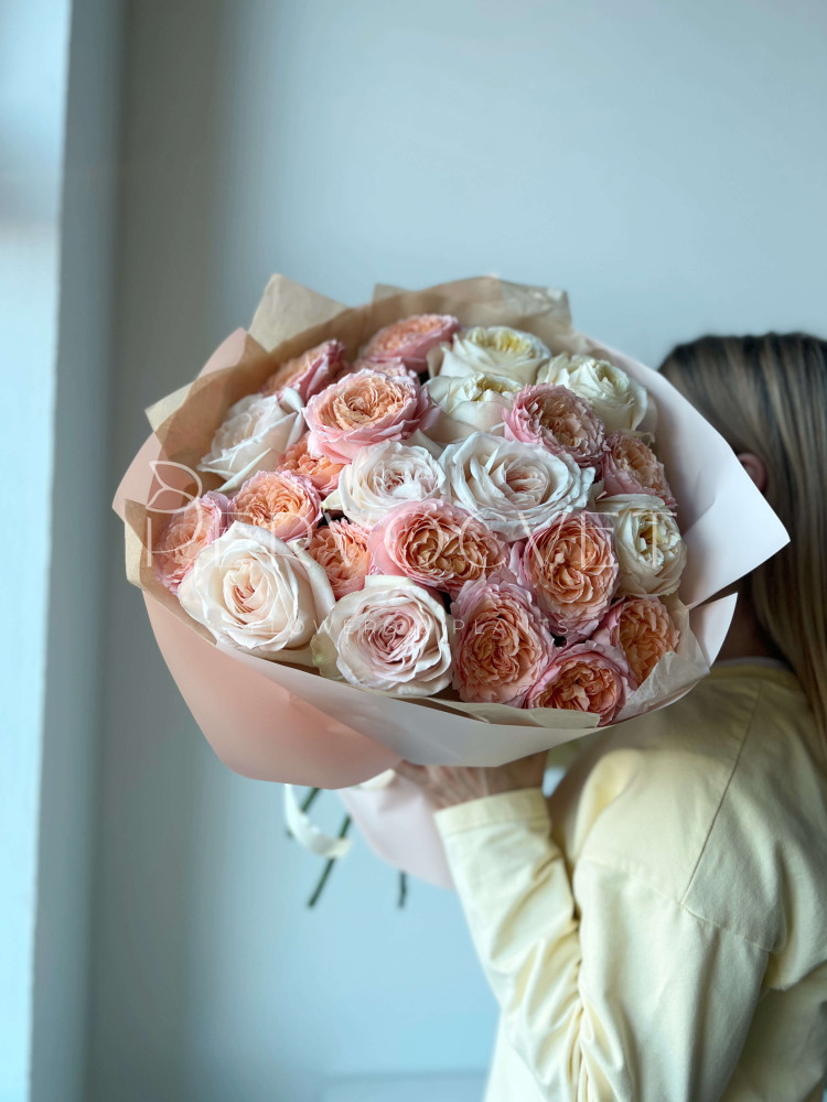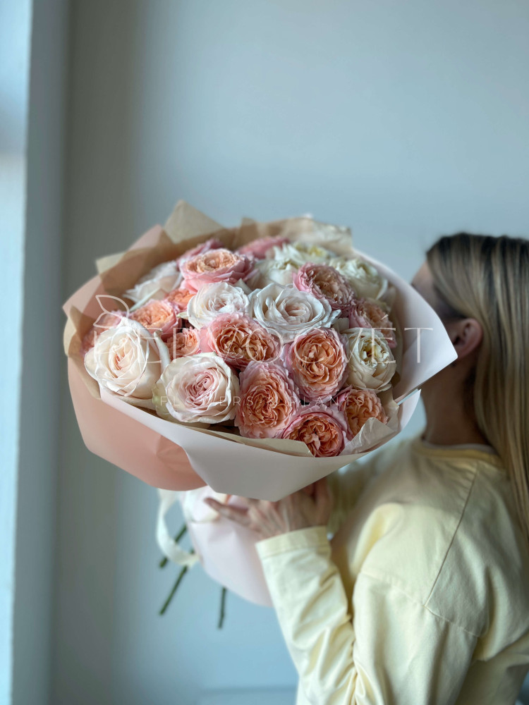 Она любит только пионовидные розы? Тогда этот букет для нее! Самая ароматная роза из всех сорта Охара, и уникальная роза, на выведение которой понадобилось 10 лет, сорта Джульетта. Красивые пастельные оттенки и объемный букет!