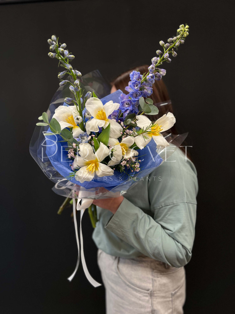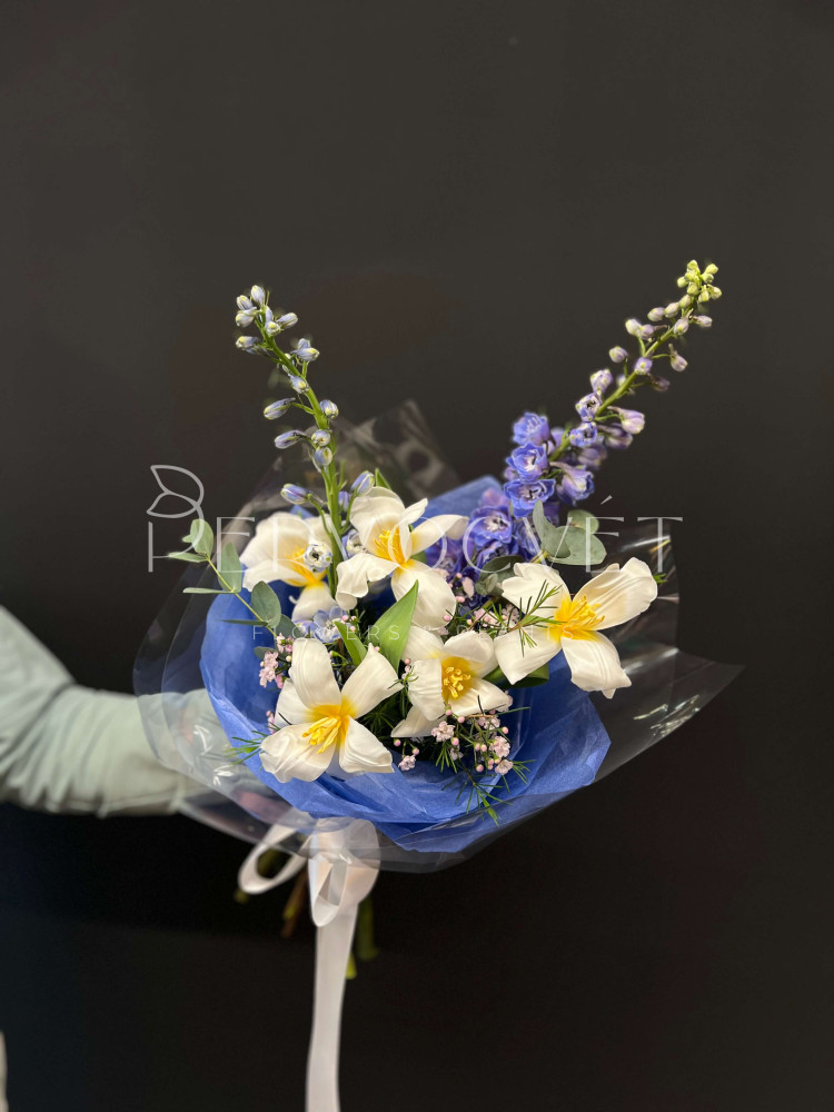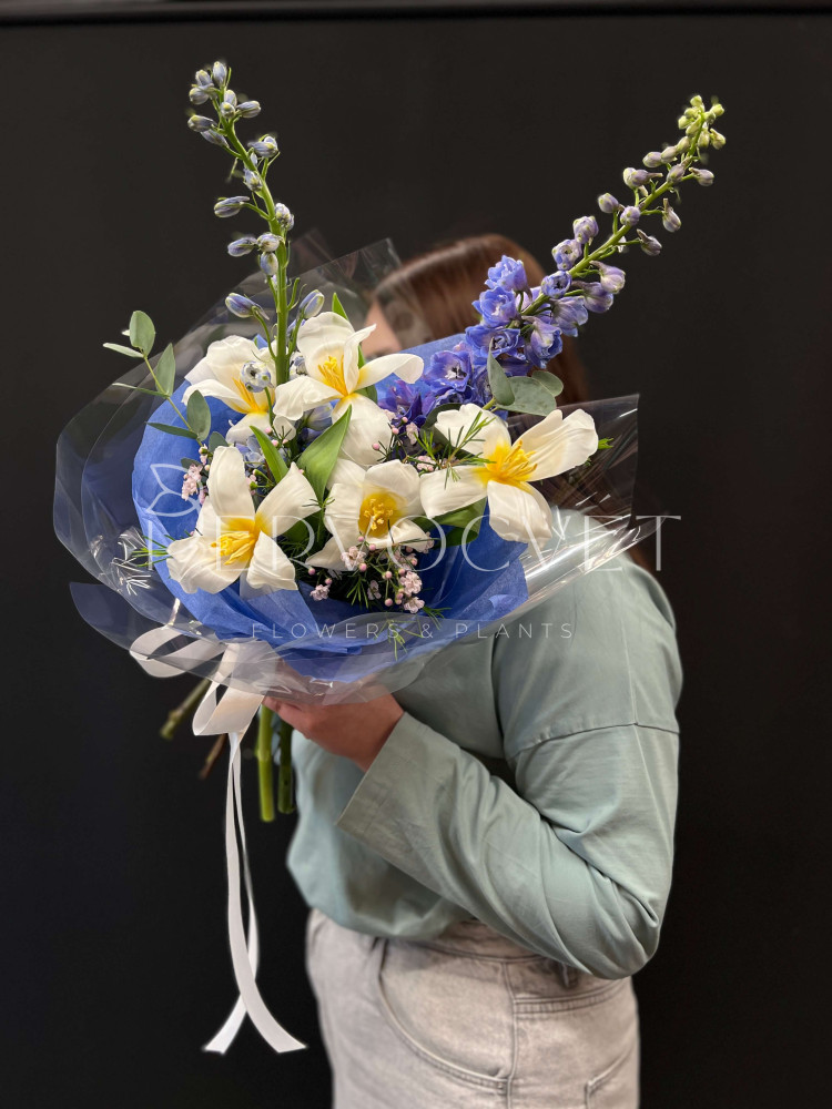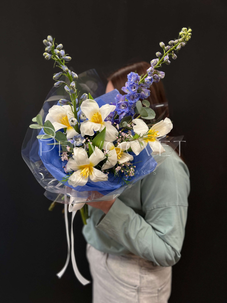 Сочетание уникальное: вывернутый белый тюльпан и синий дельфиниум - очень акцентные цветы, которые совсем не конкурируют между собой. Авторское и дерзкое сочетание, которое не оставит равнодушными никого !
