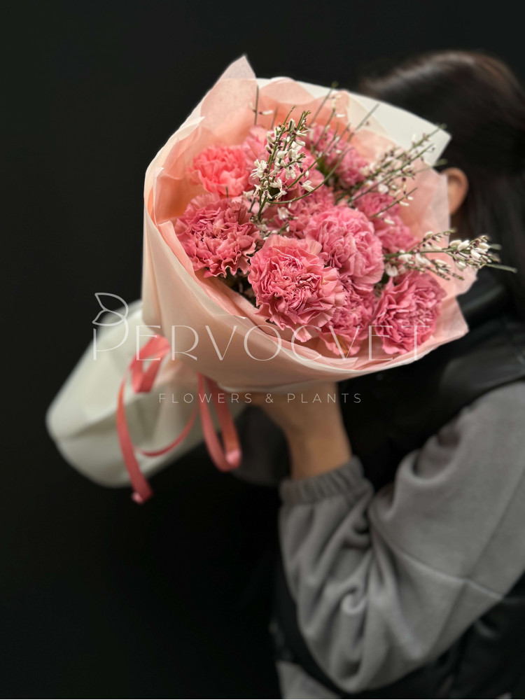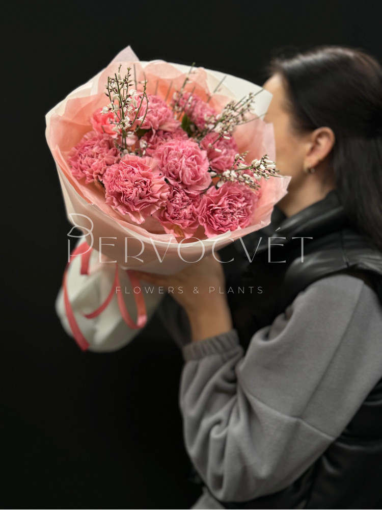 Букет малиновых сортовых гвоздик с ароматным хамелациумом. Яркий и сочный малиновый цвет в пышной стильной упаковке, с принтом страниц глянцевого журнала!