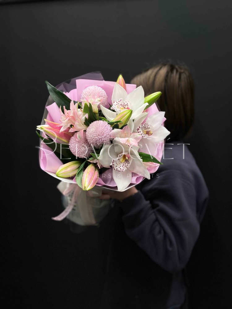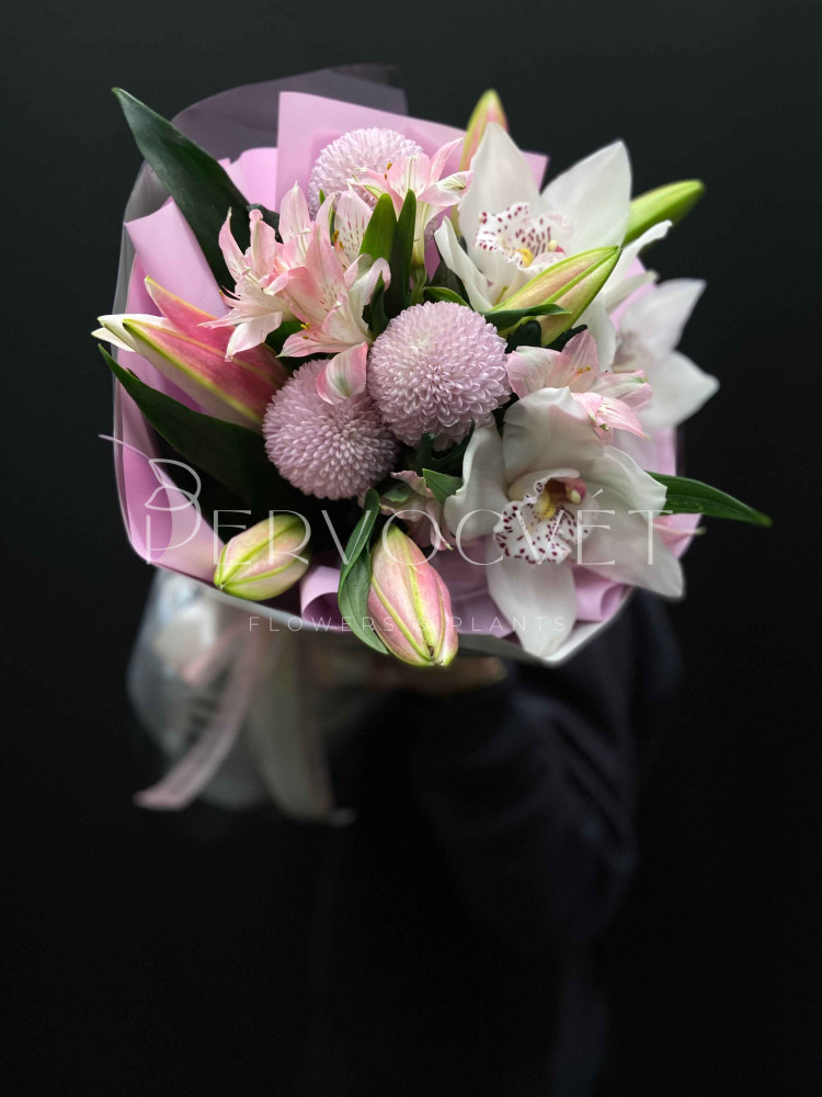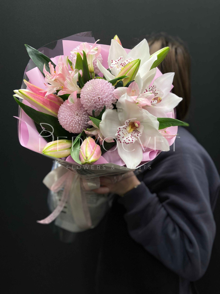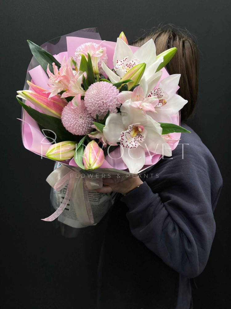 Ароматный букет в розово-сиреневых оттенках с бутонами лилии и альстромерий, белыми орхидеями и шарообразной хризантемой Момоко. Разные, хорошо сочетаемые фактуры в одной композиции!