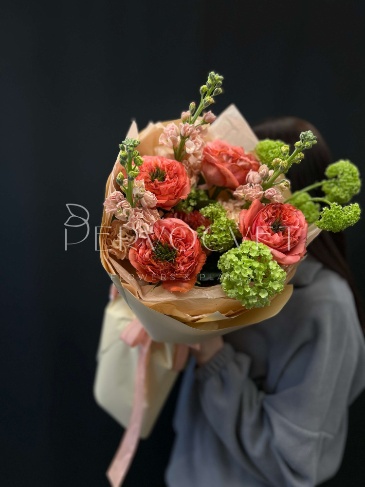 - БОЛЬШОЙ - маттиола 7, пионовидная роза Мандарин Экспрешн 11, вибурнум зеленый 3