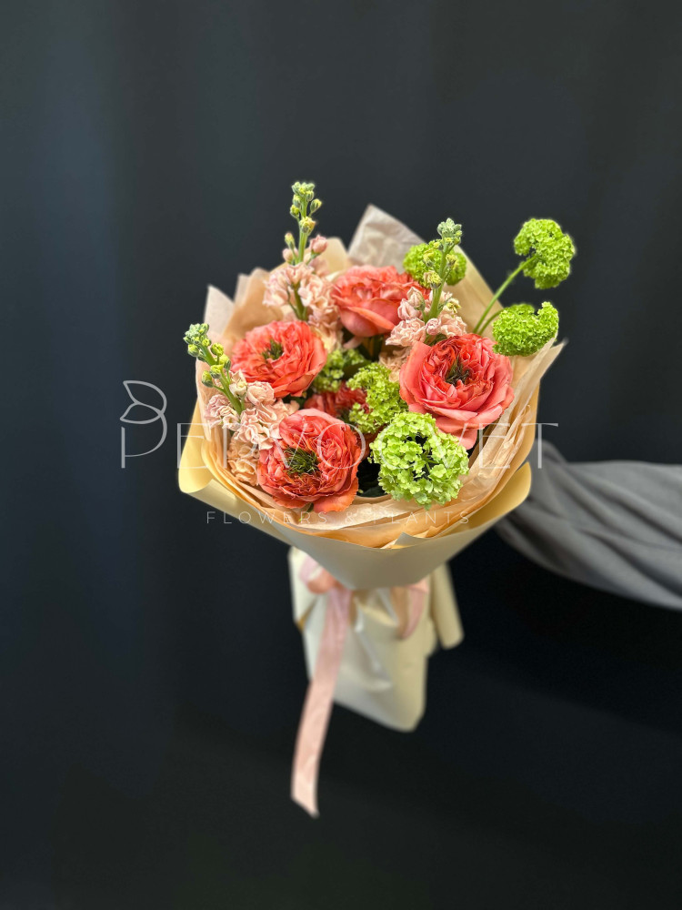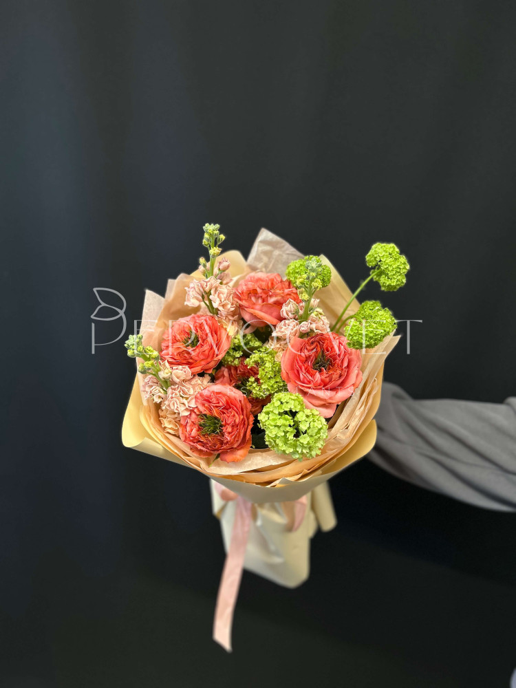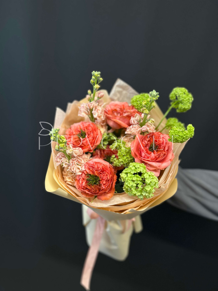 состав: маттиола, пионовидная роза Мандарин Экспрешн, вибурнум зеленый