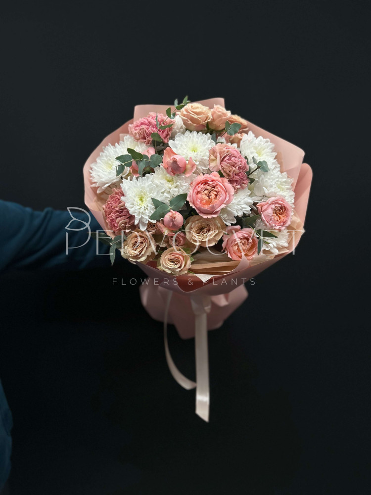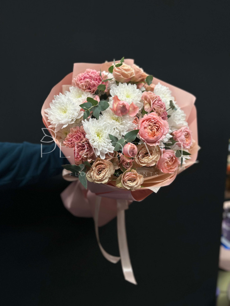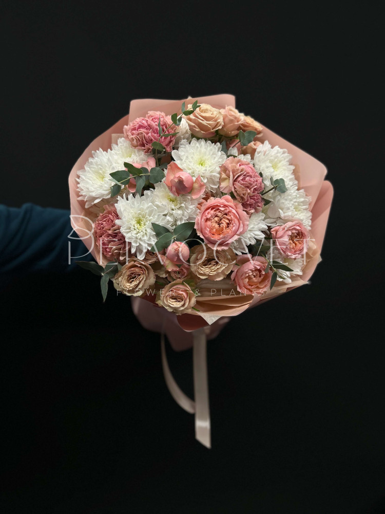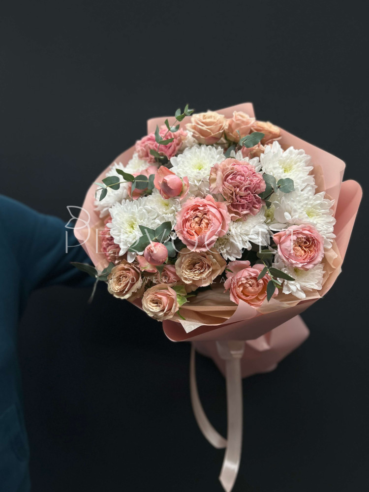 состав: хризантема, кустовая роза, кустовая пионовидная роза Джульетта, гвоздика, эвкалипт