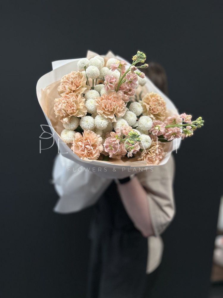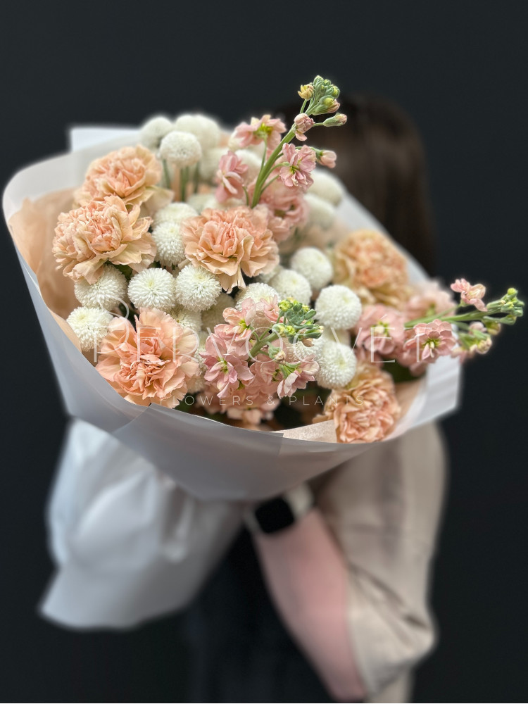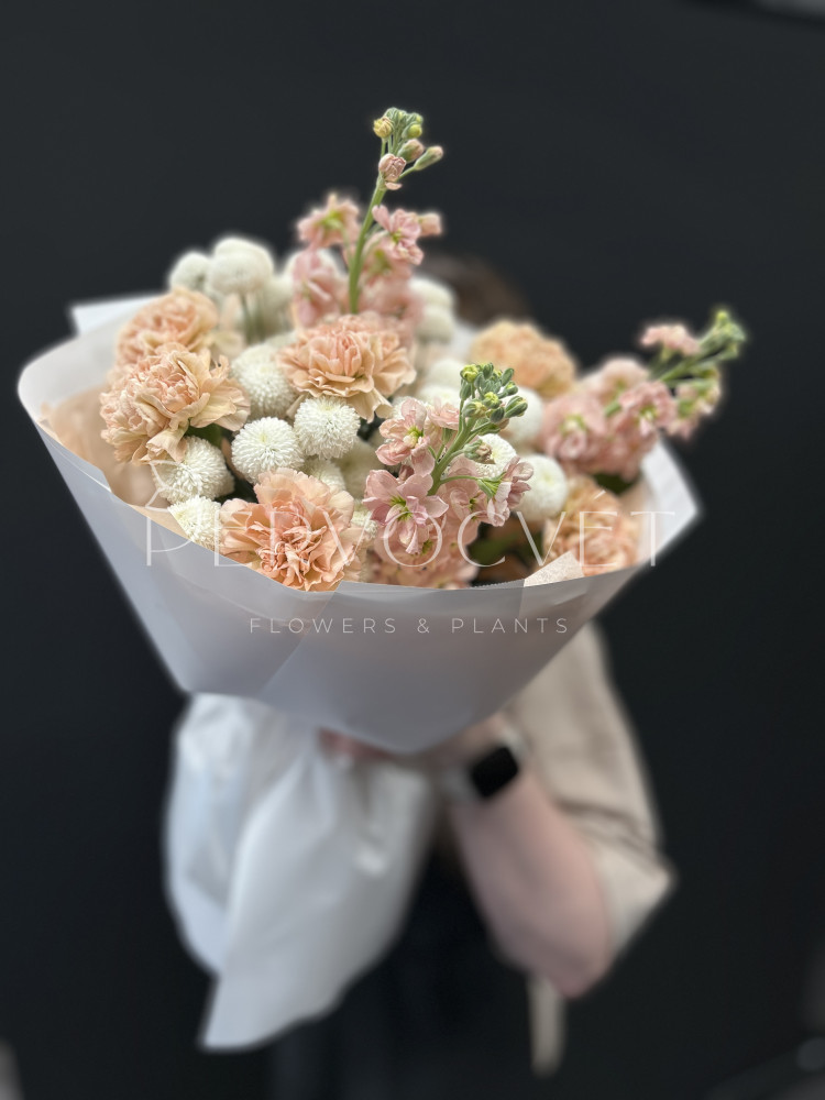 Нежные оттенки сортовых гвоздик, маттиолы и хризантемы Ньютон в летнем стойком букете. А тонкий аромат покорит получательницу.