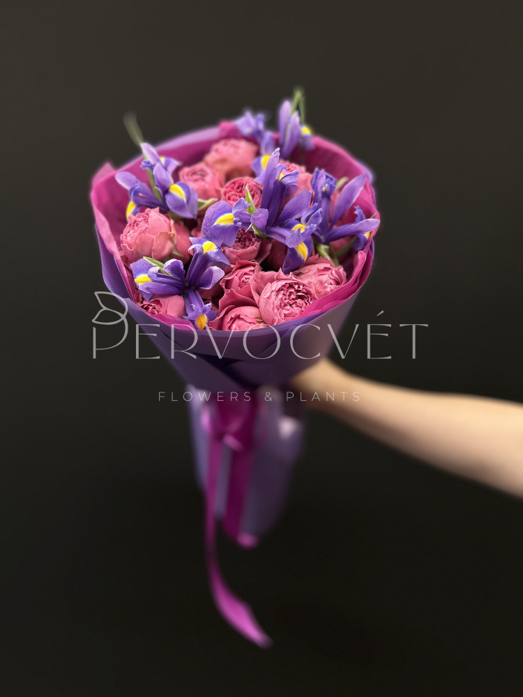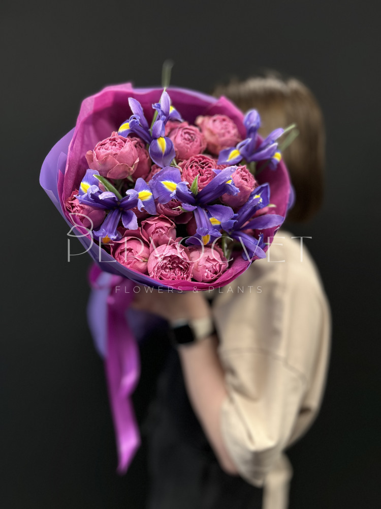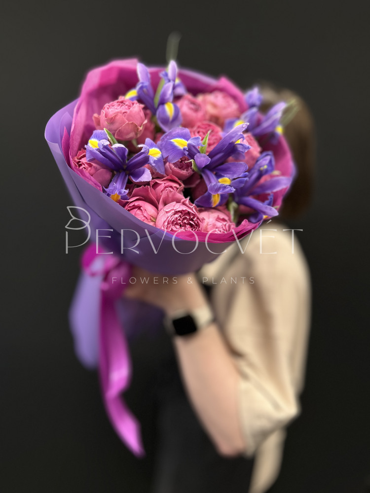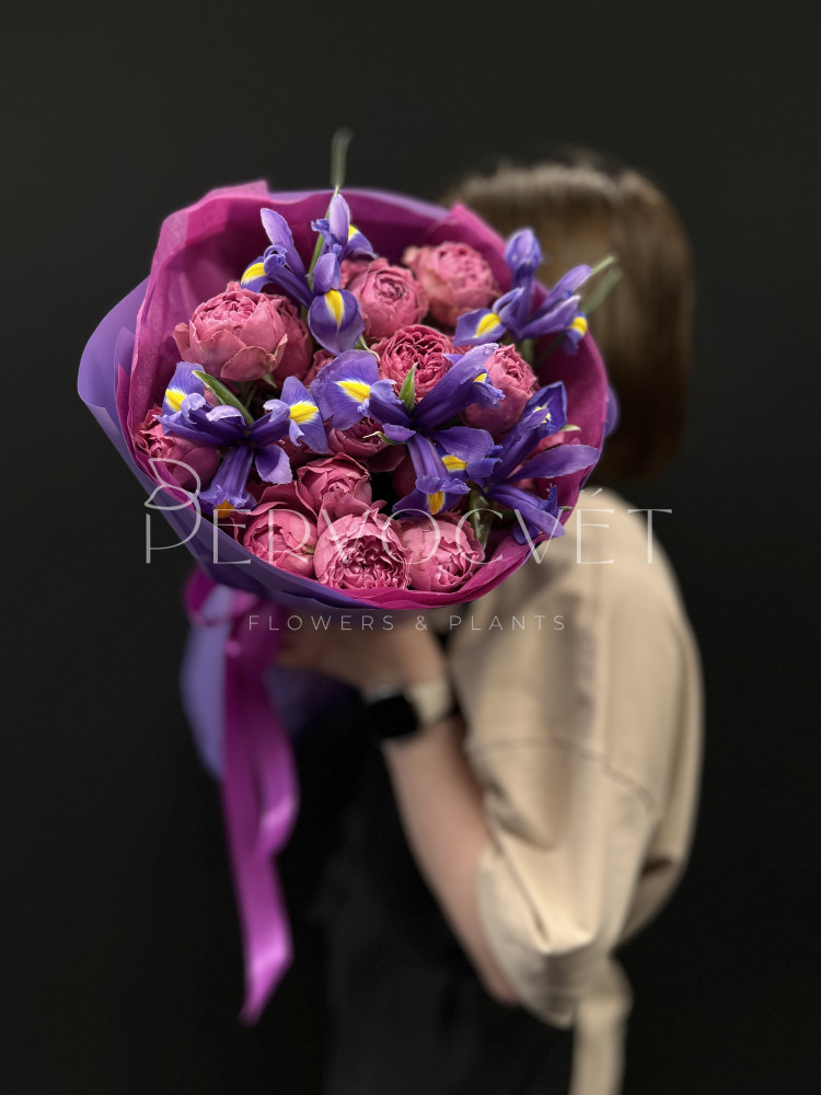 Яркий букет фиолетового цвета или фуксии. Хит продаж - кустовая пионовидная роза Мисти Баблз и стойкие синие ирисы. Яркий букет, редкий цвет!