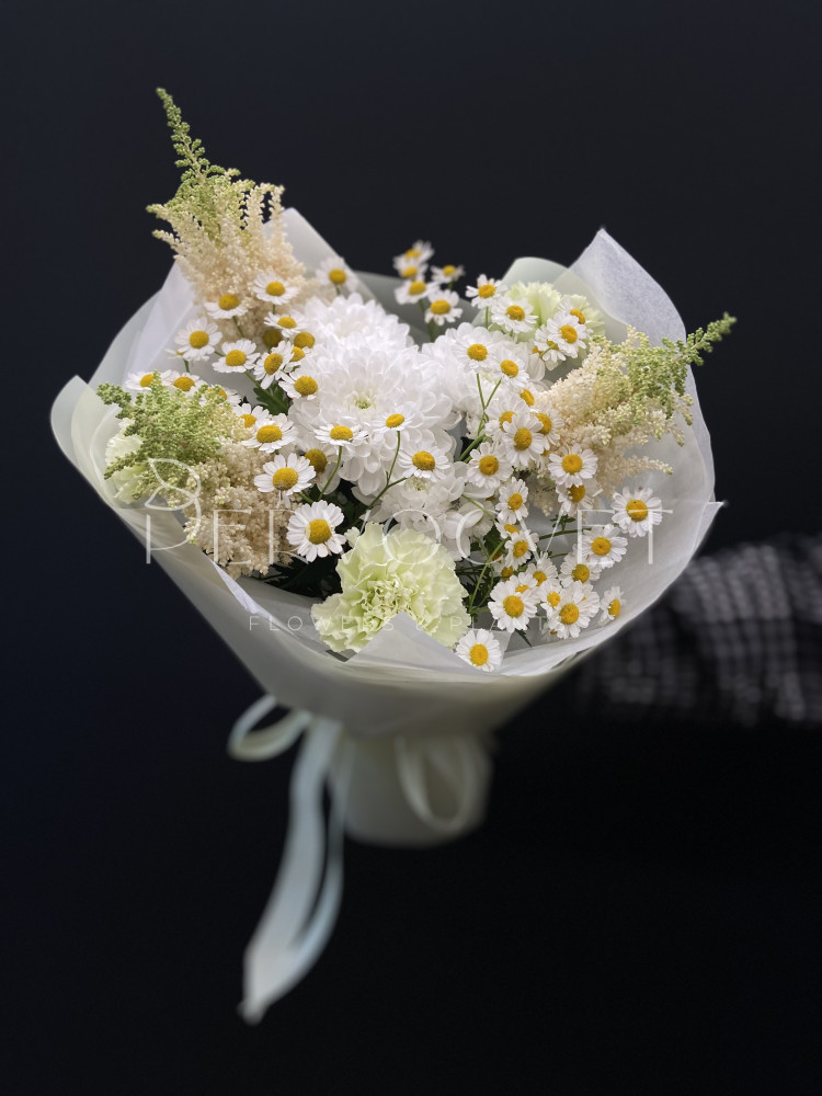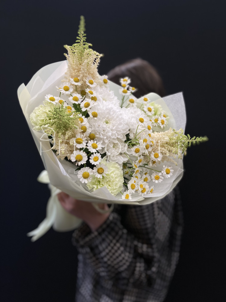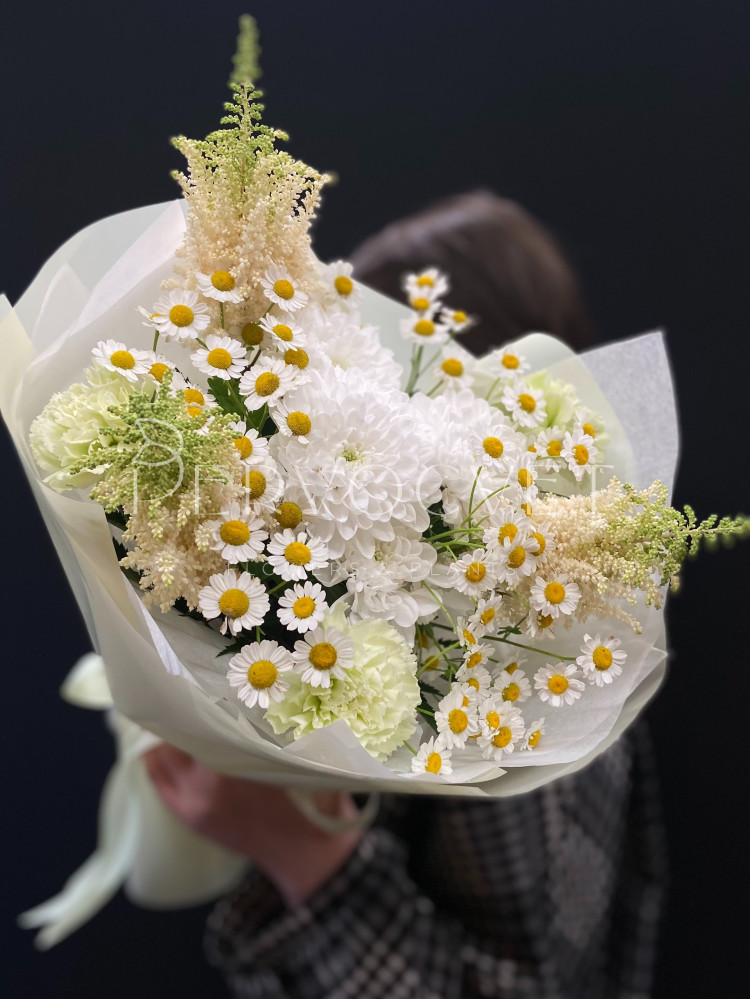 Нежный букет с ромашкой Танацетума, диантусами и стойкой хризантемой с акцентами белой астильбы. Нежный ароматный букет в белых оттенках!