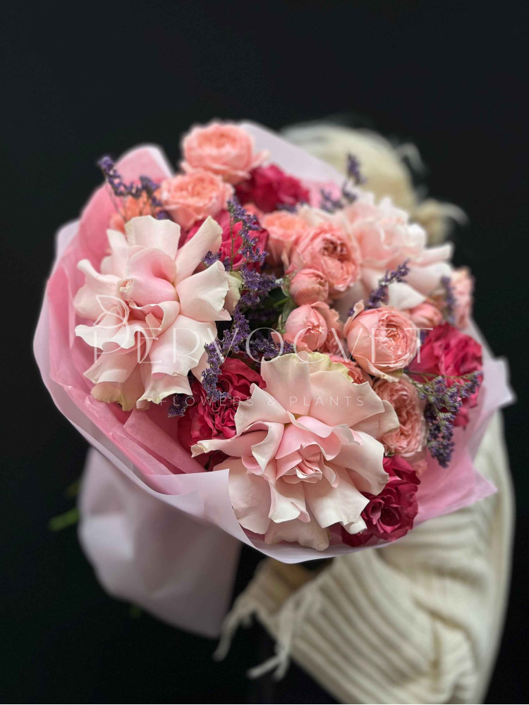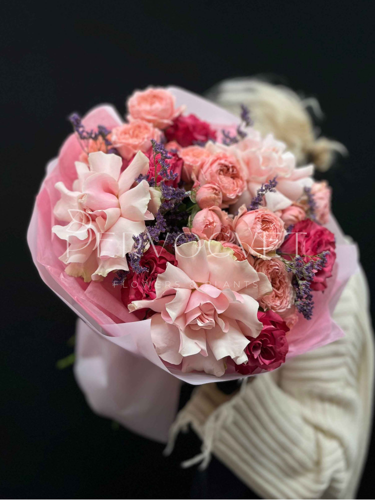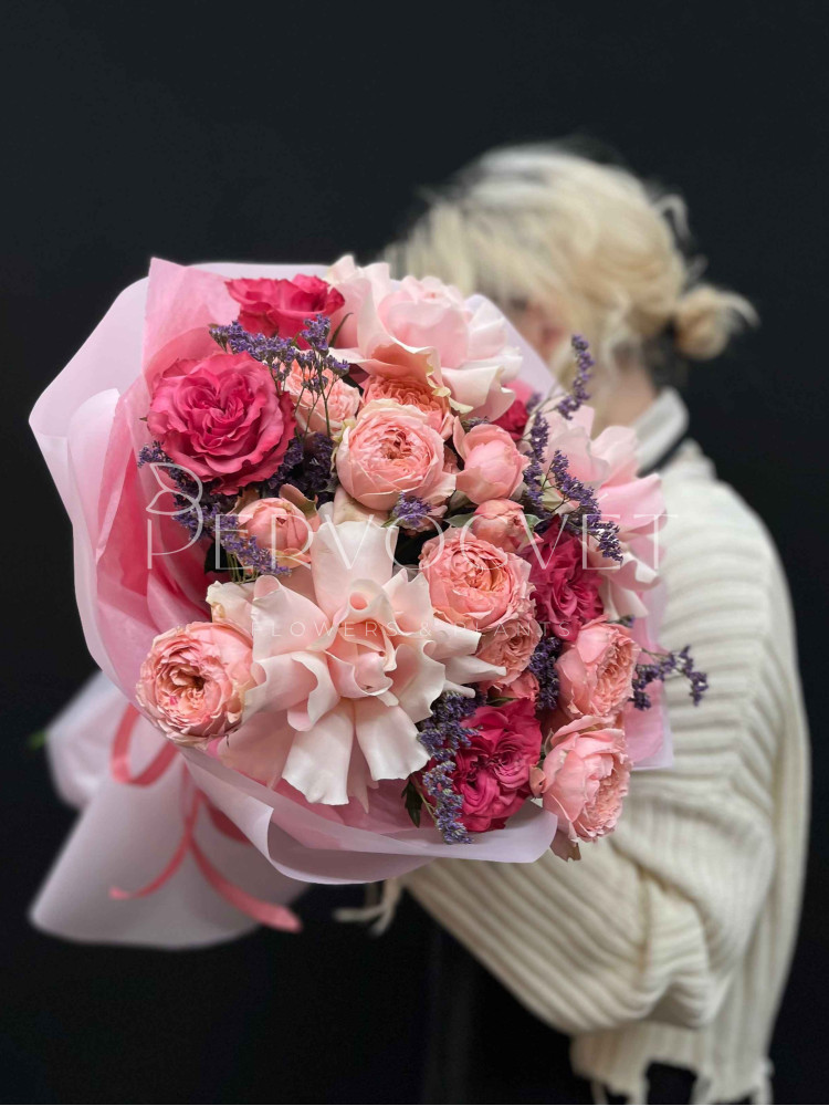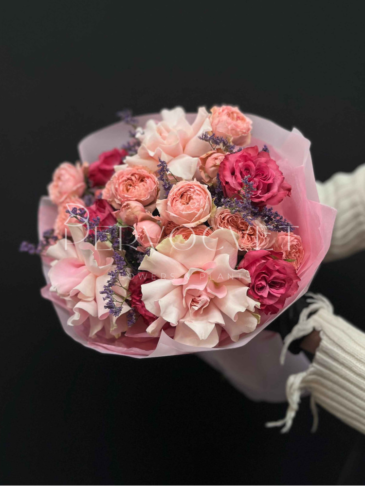 Три вида роз и мелкие цветочки лимониума - красивое ажурное сочетание оттенков розового и пионовидных раскрытий: малиновая пионовидная роза Кантри Блюз, французская вуальная роза Пинк Мондиаль и кустовые многочисленные розочки сорта Джульетта. Люкс в чистом виде!