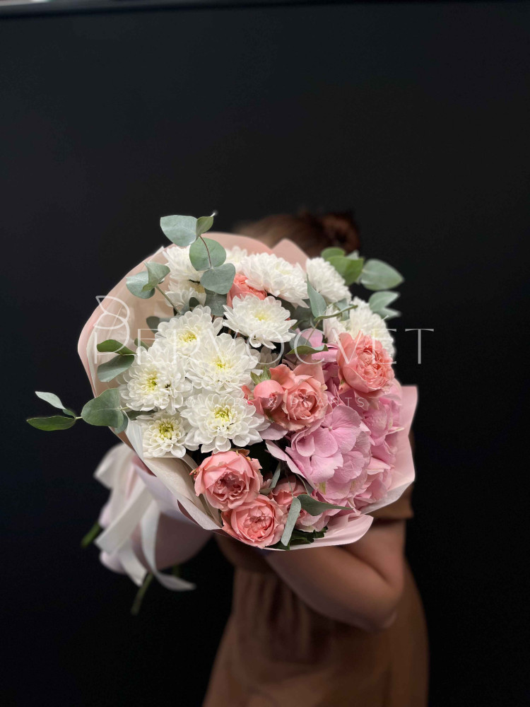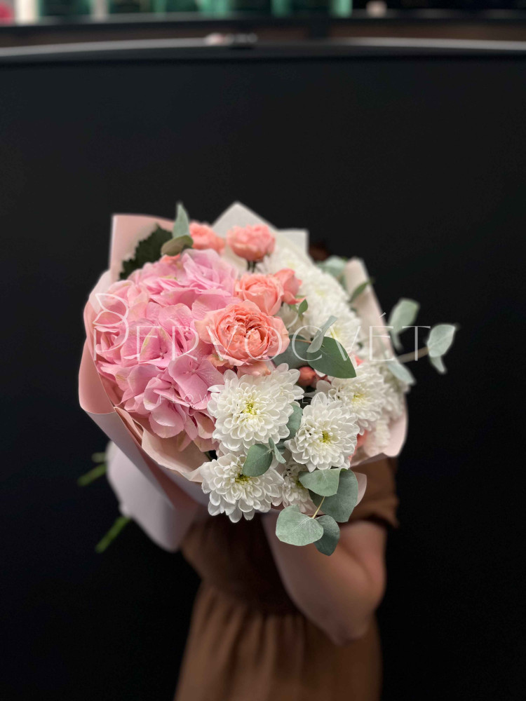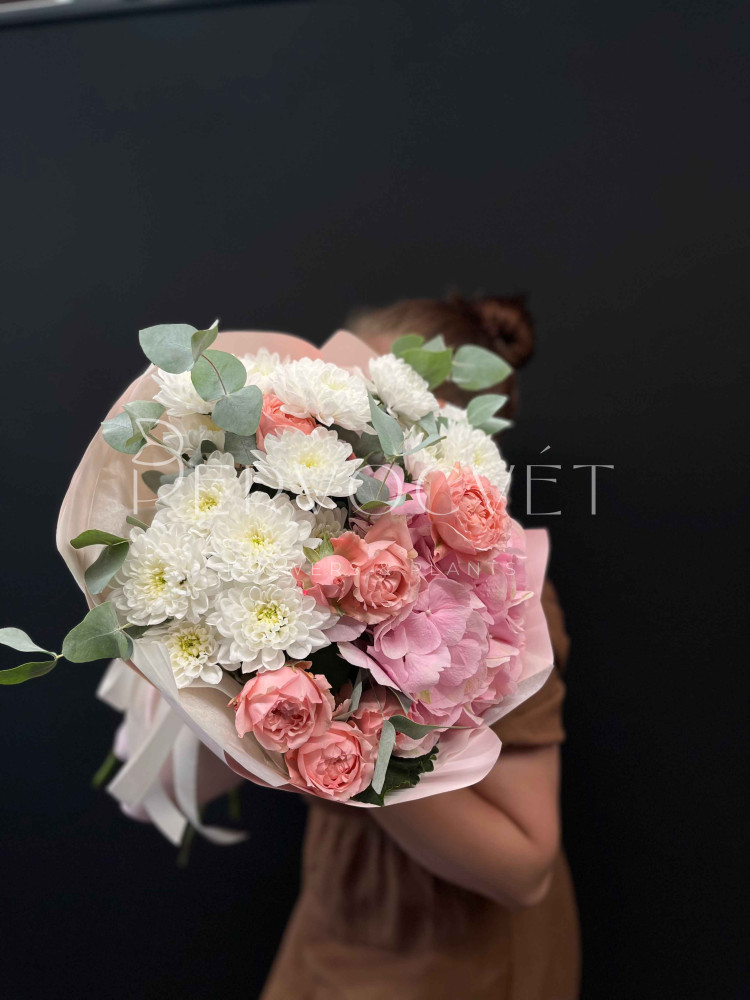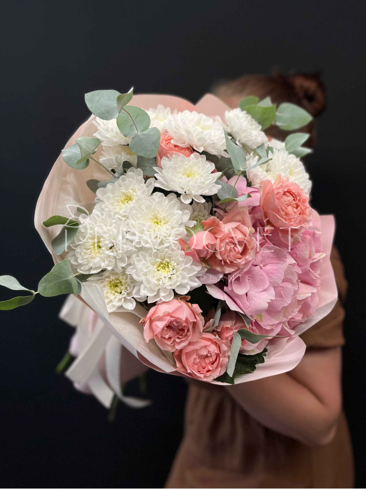 состав: гортензия импорт, хризантема, кустовая пионовидная роза, эвкалипт
