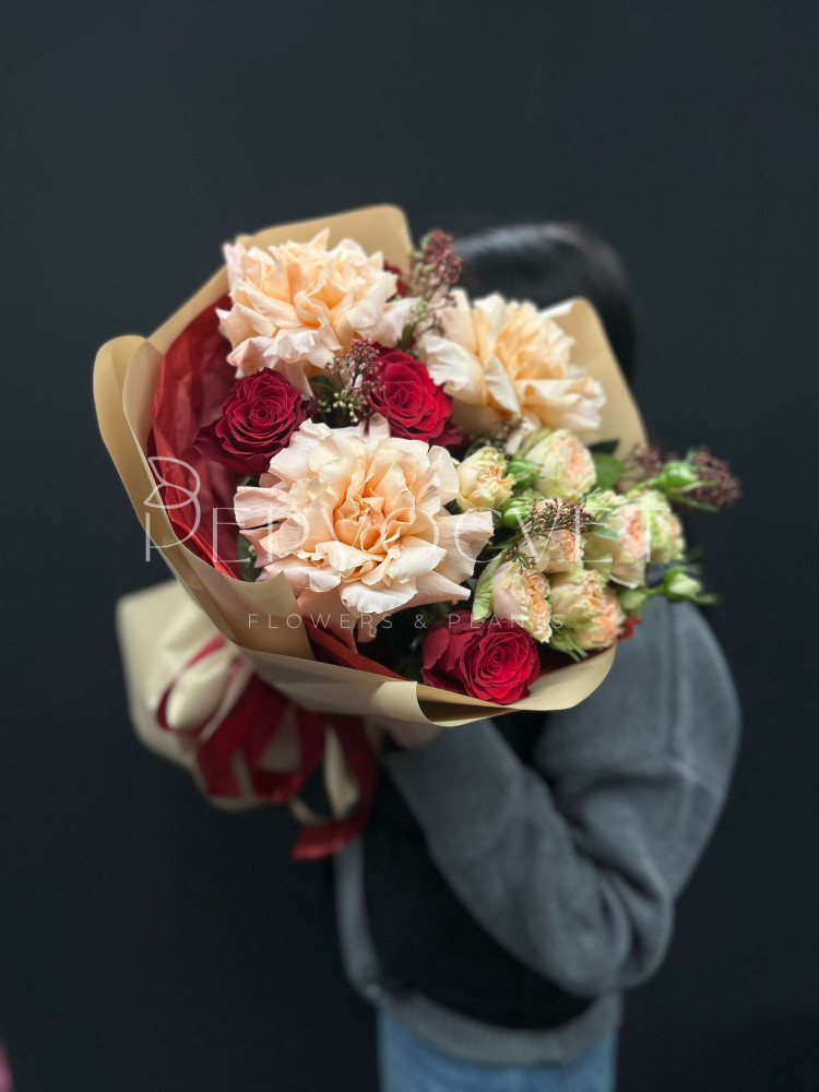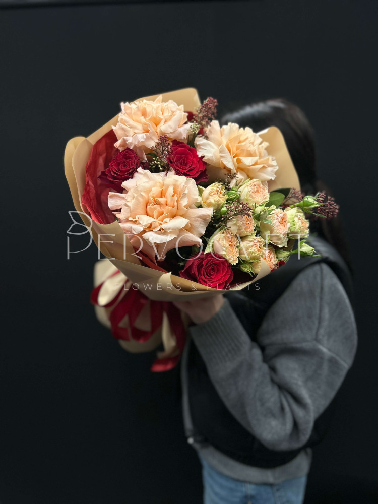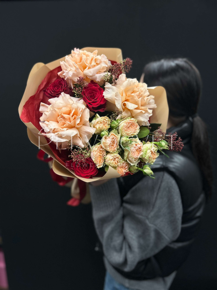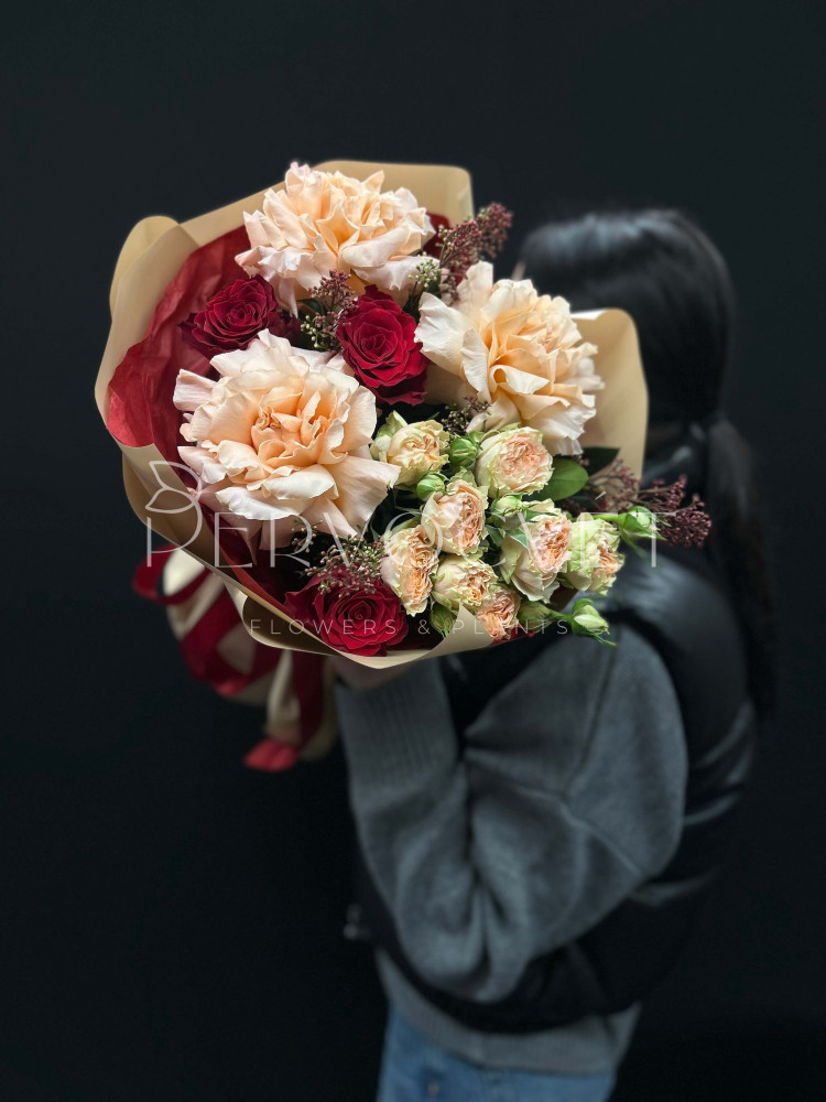 состав: французская роза, роза Эквадор, роза кустовая, скиммия