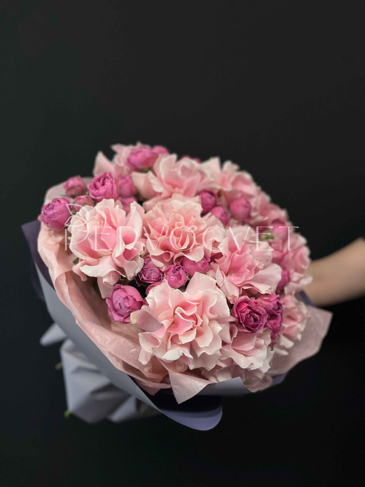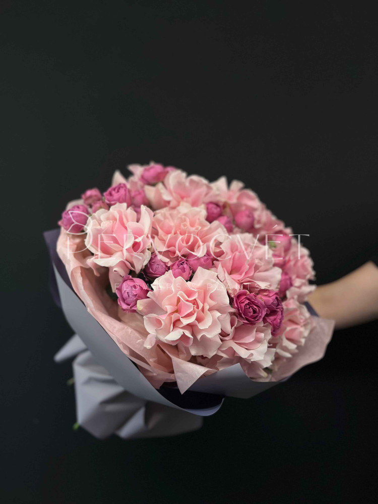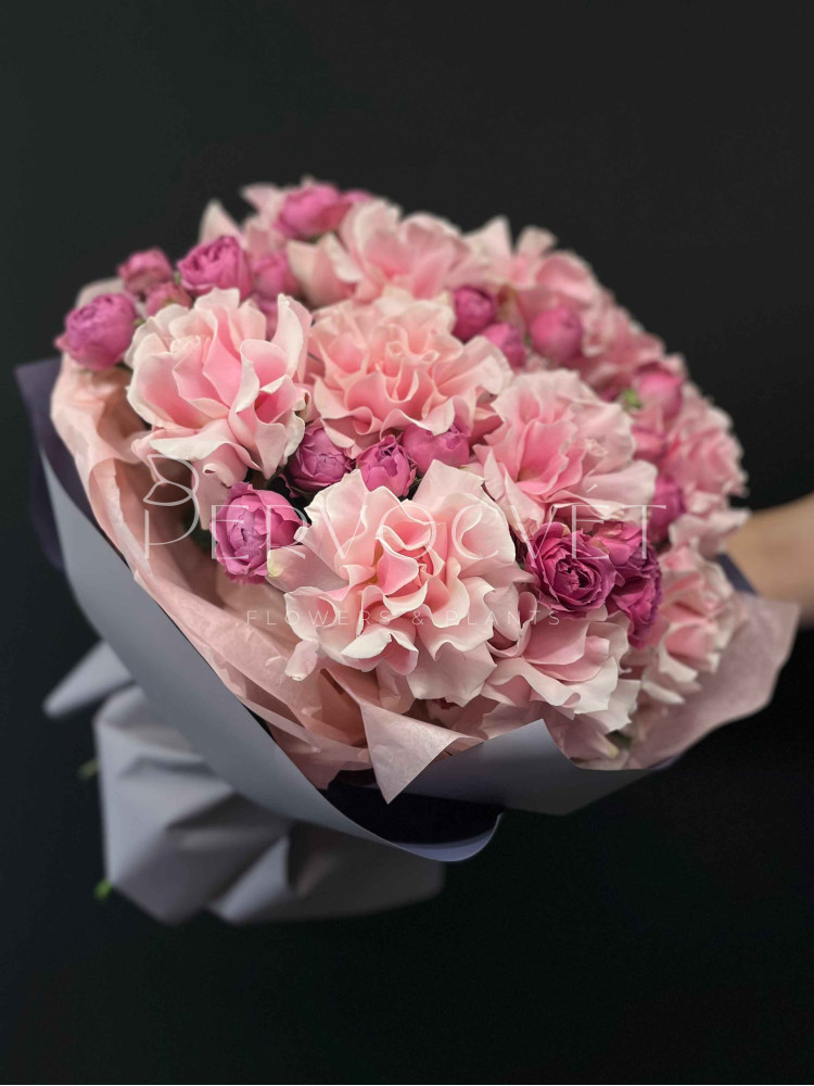ЛЮКС-букет: сочетание розовых сортов роз, желанных каждой! Пионовидные розочки Мисти Баблз цвета фуксии и контрастные светло-розовые французские розы, профессионально сформированные нашими флористами. Дарите красивые букеты!